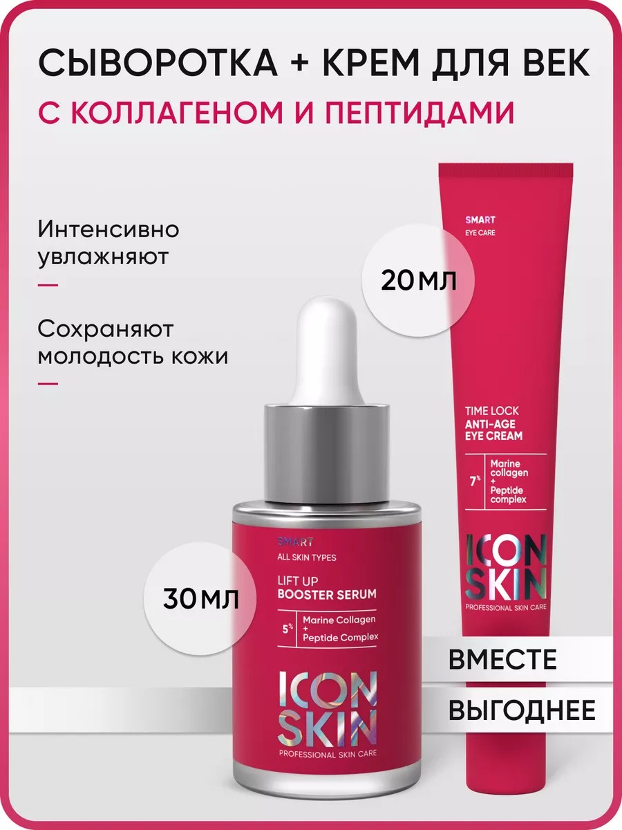 Подарочный набор антивозрастного ухода с коллагеном и пептидами. Оказывает комплексное воздействие anti age, устраняет признаки старения. Сыворотка-концентрат для лица стимулирует синтез собственного коллагена, дополнительно увлажняет и поддерживает правильный гидробаланс. Усиливает естественный защитный барьер кожи и ускоряет процессы регенерации. Крем для кожи вокруг глаз глубоко увлажняет, подтягивает и выравнивает, способствует разглаживанию и заполнению морщин, уменьшает их выраженность. Активно укрепляет контуры век, обладает противоотечным эффектом. При регулярном нанесении восстанавливает увлажненность, упругость и эластичность. Морской коллаген и пептиды в составе стимулируют синтез собственного коллагена, уменьшают проявления возрастных изменений, уменьшают выраженность морщин. Результат: увлажненная и упругая кожа, возрастные изменения менее выражены. Подходят для всех типов кожи, особенно зрелой – для интенсивного ежедневного anti-age ухода и омоложения. Для дневного и ночного применения. Подарок девушкам и женщинам для красоты и молодости в любом возрасте! Система SMART от ICON SKIN – уходовая косметика с формулами направленного действия. Сочетается с другими косметическими средствами бренда и усиливает их.