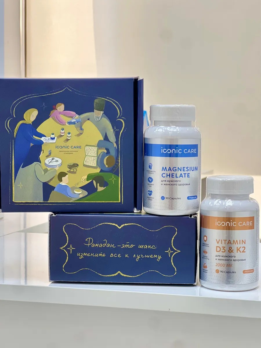 Набор витаминов от Iconic Care - это Бокс ЗДОРОВЬЯ для восстановления организма по выгодной цене. в красивой упаковке, подойдет на подарок маме, папе, бабушке, дедушке... В набор входят базовые витамины Iconic Care на 1,5 месяца. Витамин Д3 с К2 укрепляет иммунитет, повышает прочность костей и зубов, ускоряет обмен веществ. Магний хелат укрепляет нервную систему, способствует расслаблению. Магний бисглицинат улучшает качество сна, выводит токсины из организма, устраняет мигрени, апатию, депресию . Хелат магния - максимально биодоступная форма. Комплекс БАД с витамином D3, К2 и Магнием хелат нормализуют работу сердца и сосудов, улучшают состояние кожи, волос и ногтей, снижают стресс и тревожность, укрепляют иммунитет. Оптимальная дозировка и состав помогут быстро восполнить имеющийся дефицит. БАД от Айконик соответствует европейским стандартам качества. В составе добавок нет ГМО, сои, глютена и лактозы. Высочайшую степень очистки сырья и контроль качества на всех этапах производства подтверждает сертификат безопасности международной классификации ISO 22000. Набор БАД в подарочной коробке - готовый подарок для семьи и друзей. Дополнительное : Наш витаминный комплекс - это комплекс витаминов и минералов в желатиновых капсулах. Капсулы сделана из халяльного говяжего желатина, сертификат halal выложили в карточках. Бокс «ЗДОРОВЬЕ» был разработан, врачом Эндокринологом-нутрициологом, специально для мужского и женского здоровья. Набор витаминов помогает предотвратить выпадение волос и ускорить их рост. Витамин D3 играет важную роль в снижении риска возрастных изменений кожи. Мультивитамины помогают укрепить суставы и связки, повышают их эластичность и гибкость, а также предотвращают их повреждение. Витамины женские, мужские улучшают память, способствуют хорошему настроению, помогают от депрессии. Комплекс витаминов для иммунитета содержит в себе витамин D3 и минерал магний, которые помогают укрепить иммунную систему, играют важную роль в поддержании нервной системы и мозговой активности, улучшают когнитивные функции мозга. Они также могут помочь предотвратить простуду и другие заболевания. Спортивные витамины помогают увеличить выносливость, ускорить восстановление после тренировок, способствуют укреплению костей и мышц.. Они также, влияют на ускорение метаболизма и уменьшают аппетит, что может помочь в процессе похудения. Наш витаминный комплекс для мужчин и женщин является нутрицевтиком - это означает, что он содержит биологически активные добавки к пище, которые могут помочь улучшить здоровье. Витаминно-минеральный комплекс содержит ингредиенты, которые безопасны для здоровья. Комплекс витаминов подойдет для взрослых. Теги для поиска: айконик кер, магний айконик, иконик каре магний, иконик каре, иконик витамин д, бокс иконик, бокс здоровье