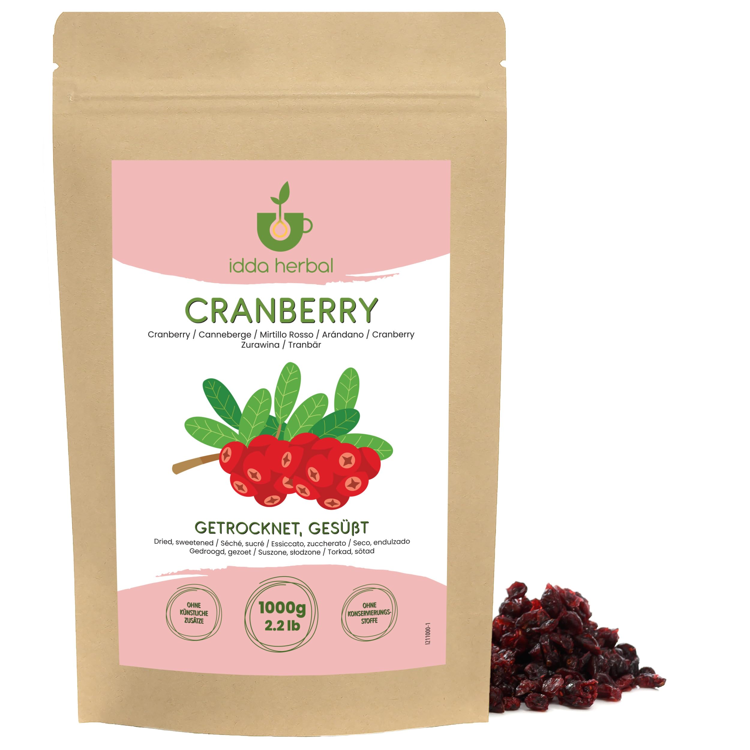 IDDA Herbal Cranberries Séchées 1kg, Canneberges Entières Séchées, Sucrées au Jus de Pomme 1 KG