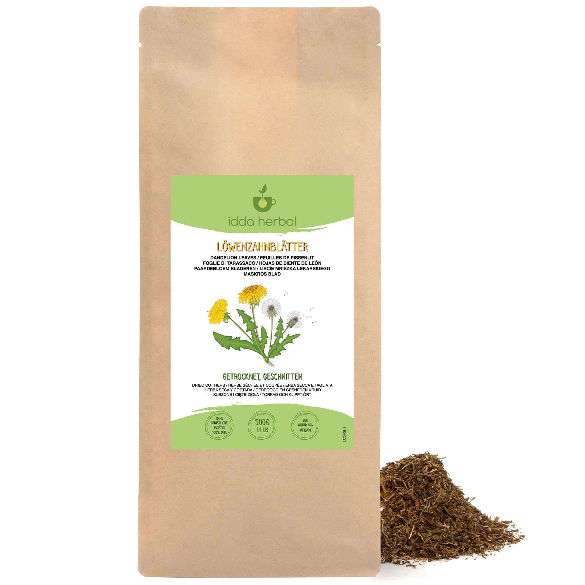 DANDELION GRASS: Known for its bright yellow flowers and serrated leaves, dandelion is a versatile herb with a rich history dating back thousands of years. Any part of the plant, including the flowers, leaves, and roots, can be used, typically for making herbal teas or regular teas. 100 PURE AND NATURAL: Our dandelion tea is a 100 natural product, with no additives, preservatives, or artificial flavors. HIGH QUALITY: Our dandelion tea maintains exceptional standards throughout the value chain, ensuring consistently high quality with every use. FLAVOR AND AROMA: Dandelion tea has a unique taste that combines earthy, slightly bitter notes with subtle sweetness. Its aroma is lightly herbaceous and inviting, making it a pleasantly aromatic beverage. HIGH-QUALITY PACKAGING: Our packaging is carefully handcrafted to preserve the product's quality and ensure a long shelf life. INGREDIENTS 100 Dandelion Leaves INSTRUCTIONS Pour 2 teaspoons of herb onto 1 cup (250 ml) of boiling water and let it steep for 5 to 10 minutes, depending on the desired strength. SAFETY WARNING Contains no caffeine MANUFACTURER'S DETAILS Alpi Investment OOD, G S Rakovski 164, 1000, Sofia, BG See moreCarefully handled from field to package: Each batch is processed to strict quality standards—from selection and drying to hand-packing—to ensure consistency and freshness. Carefully selected ingredients: We work with trusted growing regions to ensure our dandelion leaves are cultivated in clean, well-managed environments for superior quality. Easy to prepare: Add 2 teaspoons to 250 ml of boiling water and let it steep for 10 minutes. Enjoy it plain or blend it with herbs like mint or nettle for added aroma and depth. One-ingredient simplicity: This tea is made from only pure dandelion leaves, with no additives, preservatives, or artificial ingredients. It's a wholesome, plant-based choice for those who appreciate purity in every cup. Rooted in tradition: Harvested from the classic European meadow plant Taraxacum officinale, our dandelion tea contains delicately dried and cut leaves, long prized for their botanical character and crisp, earthy flavor.IDDA Herbal Pissenlit Tisane 500g, Feuilles Séchées et Coupées pour Infusions, Tisane PissenlitDESCRIPTION DU PRODUIT DESCRIPTION DU PRODUIT HERBE DE PISSENLIT : Connue pour ses fleurs jaune vif et ses feuilles dentelées, le pissenlit est une herbe polyvalente avec une riche histoire remontant à des milliers d'années. N'importe quelle partie de la plante, y compris les fleurs, les feuilles et les racines, peut être utilisée, généralement pour préparer des tisanes ou des thés. 100 PUR ET NATUREL : Notre thé au pissenlit est un produit 100 naturel, sans additifs, conservateurs ou arômes. HAUTE QUALITÉ : Notre thé au pissenlit maintient des normes exceptionnelles tout au long de la chaîne de valeur, une qualité élevée et constante à chaque utilisation. SAVEUR ET ARÔME : Le thé au pissenlit a un goût unique qui combine des notes terreuses et légèrement amères avec une douceur subtile. Son arôme est légèrement herbacé et invitant, ce qui en fait une boisson agréablement aromatique. EMBALLAGE DE HAUTE QUALITÉ : Notre emballage est soigneusement fabriqué à la main pour préserver la qualité du produit et assure une longue durée de conservation. INGRÉDIENTS 100 feuilles de pissenlit MODE D'EMPLOI Versez 2 cuillères à café d'herbe sur 1 tasse (250 ml) d'eau bouillante et laissez infuser pendant 5 à 10 minutes selon la force désirée. AVERTISSEMENT DE SÉCURITÉ Ne contient pas de caféine COORDONNÉES DU FABRICANT Alpi Investment OOD, G S Rakovski 164, 1000, Sofia, BG Voir plusManipulé avec soin du champ à l'emballage: Chaque lot est traité selon des normes de qualité strictes - de la sélection et du séchage à l'emballage manuel - pour offrir consistance et fraîcheur. Ingrédients soigneusement sélectionnés: Nous travaillons avec des régions de culture de confiance pour assurer que les feuilles de pissenlit sont cultivées dans des environnements propres et bien gérés pour une qualité supérieure. Facile à préparer: Ajoutez 2 cuillères à café à 250 ml d'eau bouillante et laissez infuser 10 minutes. Dégustez nature ou mélangez avec des herbes comme la menthe ou l'ortie pour plus d'arôme et de profondeur. Simplicité d'un seul ingrédient: Ce thé est élaboré uniquement à partir de feuilles de pissenlit pures, sans additifs, conservateurs ni ingrédients artificiels. C'est un choix sain et végétal pour ceux qui apprécient la pureté à chaque tasse. Enraciné dans la tradition: Récolté à partir de la plante de prairie européenne classique Taraxacum officinale, notre thé au pissenlit contient des feuilles délicatement séchées et coupées, appréciées depuis longtemps pour leur caractère botanique et leur saveur croquante et terreuse.