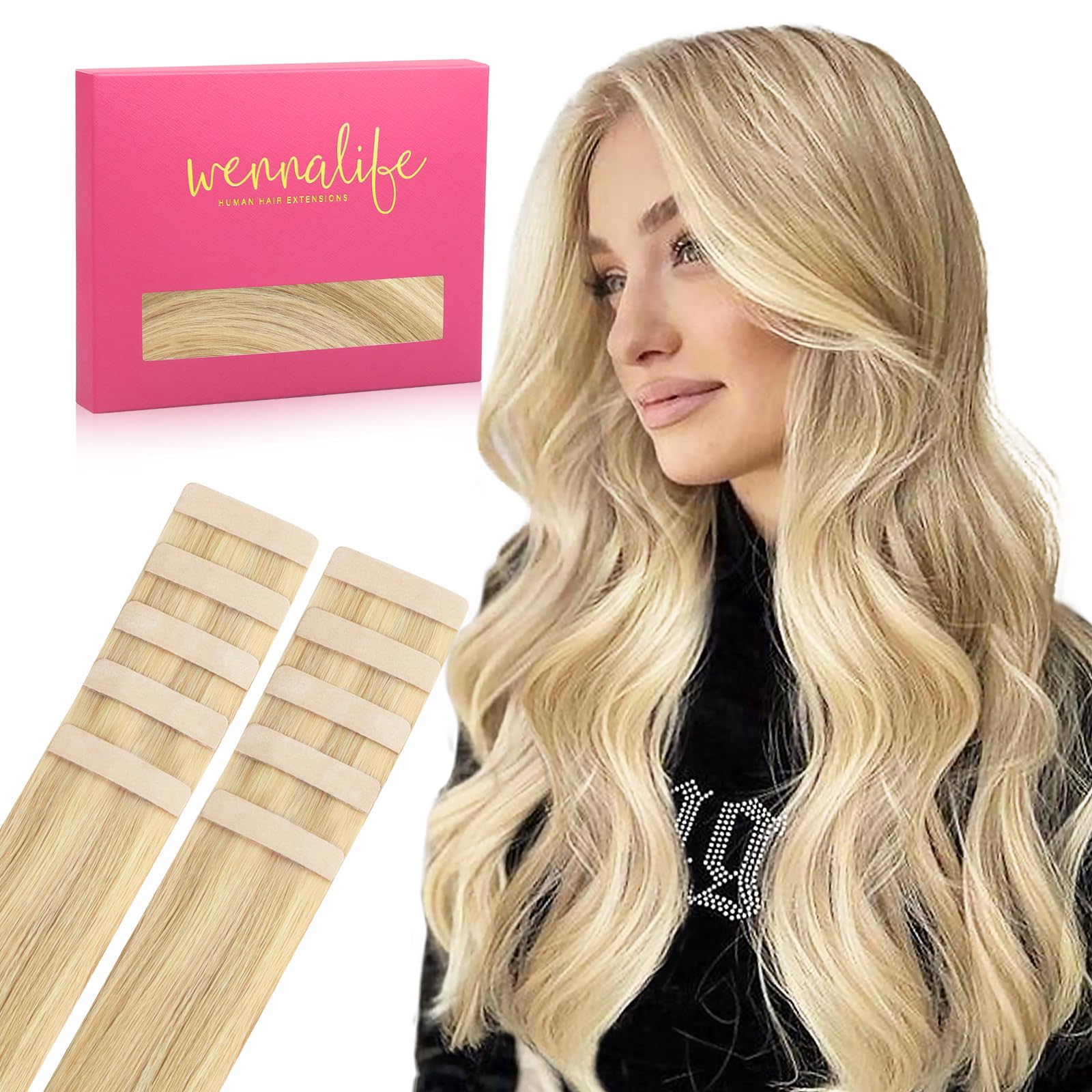 ?Care instructions? It is normal for you to have a slight loss of color when you wash your hair first, just like when we dye our own hair.We treated it to fix the color, but it can still be a little floating color.Please use a mild shampoo and a mild care flushing, carefully wash it off with warm water and let it dry in the air.At Wennalife you can buy high -quality extensions with a clear conscience.?Premium quality tape in? When it is made of high -strength invisible band.Hypoallergenes, enclosure and waterproof.We recommend heating the tape moderately while wearing, as this increases the tape liability.We also provide 6 pieces of adhesive tape free of charge to replace the tape in the event of a problem.To ensure that you do not damage your natural hair, you need to use professional tape removal products.?Tape extensions real hair specification? Tape in extensions real hair specification: length: 25cm to 65cm, width: 4cm, 10 pieces in one pack, weight: 25g to 30g.With our hair extensions, 1 packet is enough for highlights, for highlights for the whole head we recommend ordering 2-3 packets.For full head extensions, we recommend ordering 2-3 packs with 50g hair extension band.Please note: Washing less helps to keep the color alive.?Different colors available? Light blonde highlights gold blonde.A bright blond with a balanced ratio of ash and golden under tones - the brightest blonde without being completely platinum colors.If alife tape in Extensions real hair can mix well with your hair.We recommend choosing the color through the hair of your own root.And we would be happy to help you personally choose the right color.?High quality tape extensions real hair? If you want to improve your personal style but do not want to damage your hair, try the shiny tape extensions from Wennalife!With the right care, real hair remains soft, shiny and does not matt!Tip: Avoid wearing light clothing when you wear colored hair extensions.Our real hair extensions can be easily dilated (below 250 f), but a compartment is not recommended.?Pflegeanleitung?Es ist normal, dass es einen leichten Farbverlust gibt, wenn Sie Ihr Haar zuerst waschen, genau wie wenn wir unser eigenes Haar färben. Wir haben sie behandelt, um die Farbe zu fixieren, aber es kann immer noch ein wenig schwebende Farbe sein. Bitte verwenden Sie ein mildes Shampoo und eine milde Pflegespülung, waschen Sie es vorsichtig mit warmem Wasser ab und lassen Sie es an der Luft trocknen. Bei WENNALIFE können Sie mit gutem Gewissen hochwertige Extensions kaufen. ?Premium Qualität Tape Ins? WENNALIFE Tape sind aus hochfestem unsichtbarem Band hergestellt. Hypoallergen, fügsam und wasserdicht. Wir empfehlen, das Band während des Tragens mäßig zu erwärmen, da dies die Haftfähigkeit des Bandes erhöht. Wir stellen außerdem 6 Stück Klebeband kostenlos zur Verfügung, um das Band im Falle eines Problems zu ersetzen. Um sicherzustellen, dass Sie Ihr natürliches Haar nicht beschädigen, müssen Sie professionelle Tape-Entfernungsprodukte verwenden. ?Tape Extensions Echthaar Spezifikation?Tape in Extensions Echthaar Spezifikation: Länge: 25cm bis 65cm, Breite: 4cm, 10 Stück in einer Packung, Gewicht: 25g bis 30g. Bei unseren Haarverlängerungen reicht 1 Päckchen für Strähnchen, für Strähnchen für den ganzen Kopf empfehlen wir, 2-3 Päckchen zu bestellen. Für Vollkopfverlängerungen empfehlen wir, 2-3 Packungen mit 50g Haarverlängerungsband zu bestellen. Bitte beachten Sie: Weniger Waschen hilft, die Farbe lebendig zu halten. ?Verschiedene Farben verfügbar?Hellblond Highlights Goldblond. Ein helles Blond mit einem ausgewogenen Verhältnis von Asche und goldenen Untertönen - das hellste Blond, ohne komplett platinfarben zu sein. WENNALIFE Tape in Extensions Echthaar kann sich gut mit Ihrem Haar vermischen. Wir empfehlen, die Farbe durch das Haar Ihrer eigenen Wurzel zu wählen. Und wir helfen Ihnen gerne persönlich bei der Wahl der richtigen Farbe. ?Hochwertige Tape Extensions Echthaar?Wenn Sie Ihren persönlichen Stil verbessern möchten, aber Ihr Haar nicht beschädigen wollen, versuchen Sie die glänzenden Tape Extensions von WENNALIFE! Mit der richtigen Pflege bleibt Echthaar weich, glänzend und verfilzt nicht! Tipp: Vermeiden Sie es, helle Kleidung zu tragen, wenn Sie farbige Haarverlängerungen tragen. Unsere Echthaarverlängerungen können leicht umgestylt werden (unter 250 F), aber ein Umfärben wird nicht empfohlen.WENNALIFE Tape Extensions Echthaar Hellblond Highlights Goldblond 10pcs Tape in Extensions Echthaar 30g 55cm Invisible Haarverlängerung Echthaar Unsichtbare Glatt Tape Nachfüllpackung für Mädchen 55cm 30g 10pcs #16/22 Hellblond Highlights Goldblond