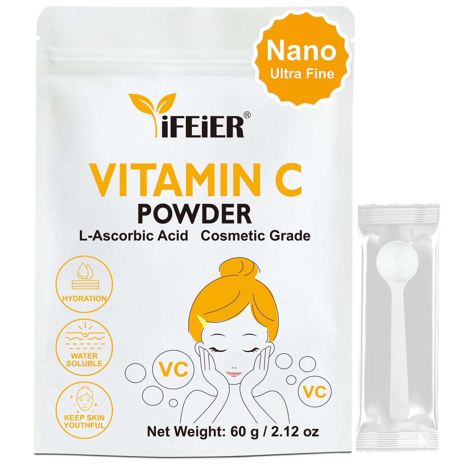 DIY-Friendly Versatile: Ideal for creating your own Vitamin C serum, lotion, cream, or facial mist. Combine with Hyaluronic Acid or Niacinamide for enhanced results. External use only. 100 Pure Cosmetic Grade: Made from premium L-Ascorbic Acid powder (Vitamin C Powder) with no fillers, fragrances, or preservatives. Double Resealable Bag Packaging, include one free measuring spoon inside the package. Nano Ultra-Fine benifit: : 1, Dissolves instantly, no graininess. 2, Smooth blending for DIY skincare 3, Superior solubility absorption. 4, Refined for silky, flawless texture. iFEiER Nano Ultra Fine cosmetic grade Vitamin C Powder for face and skin 60g(2.12oz). Many Vitamin C powders don't dissolve well in skincare recipes, leaving a gritty texture. iFEiER solves this problem with advanced ultra-fine grinding technology. Our Vitamin C powder is ground to nano grade, making it super fine so it blends easily into serums, lotions, and creams—without any graininess.