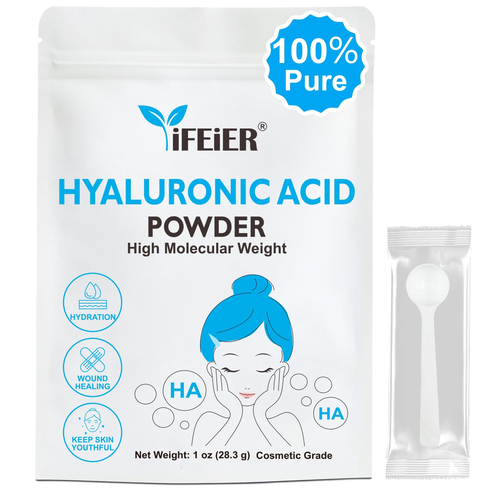 iFEiER Hyaluronic Acid Powder | High Molecular Weight Hyaluronic Acid Serum Powder | 1oz(28.3g) Cosmetics Grade | Sodium Hyaluronate | LMW HMW HA ingredient to make gel for DIY Serums