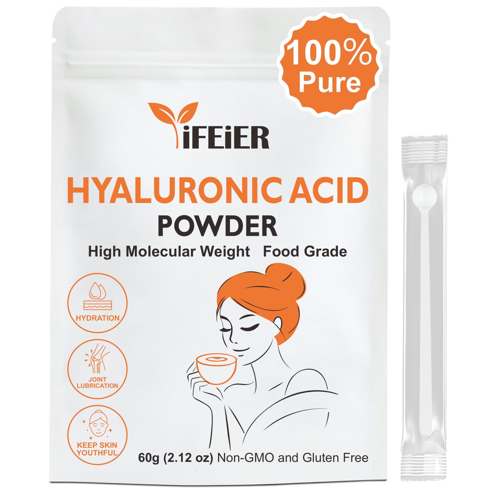1. iFEiER High Molecular Weight Hyaluronic Acid Powder (1000 1200kDa), 60g(2.12oz). Food Grade Hyaluronic Acid Supplements. Double bagged for extra protection during transit and long-term storage. Each pouch includes a free measuring spoon for easy daily use.
