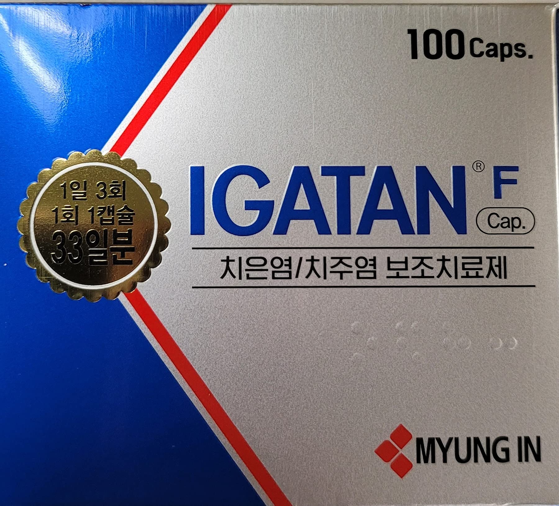 Product Name: Igatan F Capsule Manufactured, Distributed by: Myung In Pharm. Co., LTD Product Type: Dental oral medicine Main Ingredients: Carbazochrome 2 mg, Lysozyme Chloride 30 mg, Tocopherol Acetate 50% 10 mg, Ascorbic Acid 150 mg Efficacy/Effect: Supplemetal relief for various symptoms caused by gingival and alveolar pylori (redness of the gums, swelling, bleeding, and pain)* Dosage: Adults take 1 capsule at a time, 3 times a day after each meal. Precautions: 1. Carefully administer to the following patients. 1) Patients who have allergic symptoms (rash, redness, itching, etc.) with medicines and cosmetics 2) Patients receiving other drugs 3) Patients who have allergic symptoms (fever, rash, joint pain, asthma, itching, etc.) by medicine or egg 2. Side effects 1) If you experience rash, redness, diarrhea, anorexia, stomach discomfort, nausea, vomiting or stomatitis by taking this medicine, stop taking it and consult a pharmacist or doctor (dentist). 2) Skin: Stevens-Johnson syndrome (skin mucosal ocular syndrome), Riel syndrome (hypotoxic epidermal necrosis) may appear, so make a good observation, and if symptoms such as fever, erythema, itching, nystagmus, stomatitis are recognized and high fever If severe symptoms such as rashes, redness, or burns, appear on the systemic skin, mucous membranes of the mouth and throat, discontinue administration immediately and consult a physician or pharmacist. In rare cases, such serious symptoms should be seen immediately by a doctor. *These statements have not been evaluated by the Food and Drug Administration. This product is not intended to diagnose, treat, cure or prevent any disease.Dosage: Adults take 1 capsule at a time, 3 times a day after each meal. Usage: Supplemental relief for various symptoms caused by gingival and alveolar pylori (redness of the gums, swelling, bleeding, and pain).Best Sellers Rank: See Top 100 in Health & Household. Item Form: Capsule. Number of Items: 100. Active Ingredients: ascorbic acid,chloride,tocopherol. Specific Uses For Product: Joint Pain, Diarrhea, Nausea, Fever, Asthma. Brand: Myung In. : B07PG24Q1B. Manufacturer: Myung In PHARM.CO.LTD. Date First Available: March 8, 2019. Package Dimensions: 4.09 x 3.5 x 2.44 inches; 3.21 Ounces.