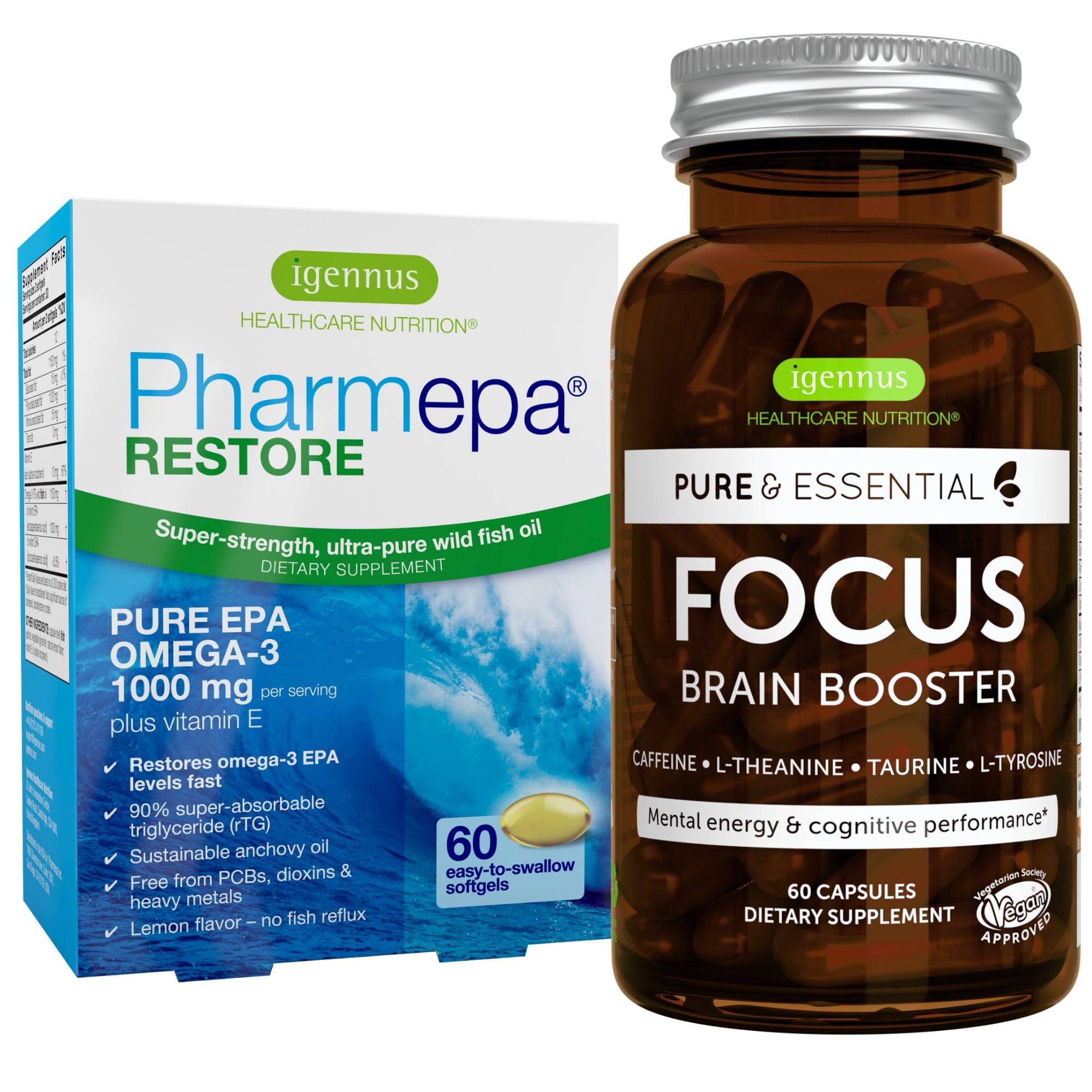 Igennus Pharmepa Restore + Focus Nootropic Attention & Focus Bundle 1000mg Pure EPA Fish Oil + 200mg Natural Caffeine Methylated B-Vitamins L-Theanine Taurine & L-Tyrosine