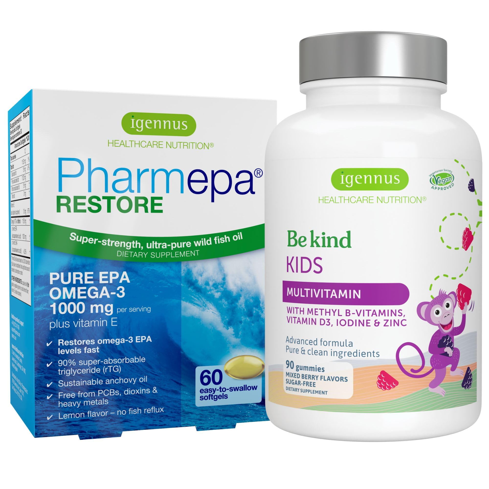 Igennus Pharmepa Restore + Methylated Kids Multivitamin Gummy Attention & Focus Bundle for 6y+ 1000mg Pure EPA Fish Oil + 90 Sugar Free Berry Gummies