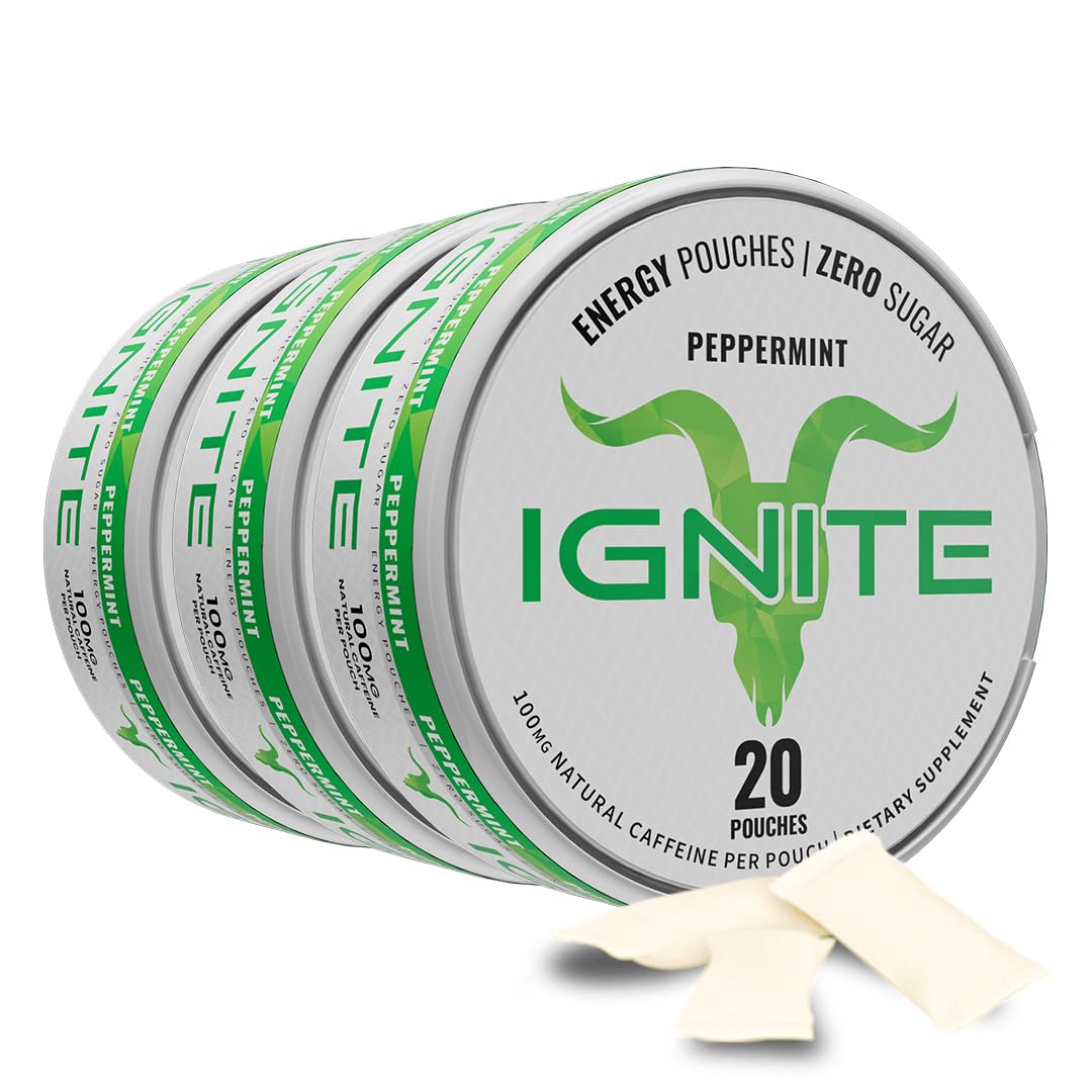 Ignite Energy Caffeine Pouches Peppermint | 5 Packs (100 Total) | 100mg Caffeine per Pouch | 20 Pouches per Pack | Sugar-Free Tobacco-Free Nicotine-Free Energy Boost Peppermint 5