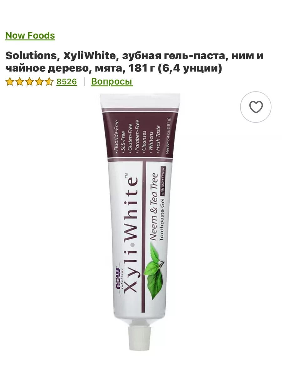 Американская зубная паста NOW Solutions, Зубная паста-гель Xyliwhite, ним и чайное дерево, очищает и отбеливает, чистый и свежий вкус, 6,4 унции, гель паста ним и чайное дерево, очищает и отбеливает, чистый и свежий вкус, 6,4 унции ОЧИЩАЕТ И ОТБЕЛИВАЕТ: XyliWhite — это замечательная гель-паста, не содержащая фтора, в которой в качестве основного ингредиента используется ксилит.