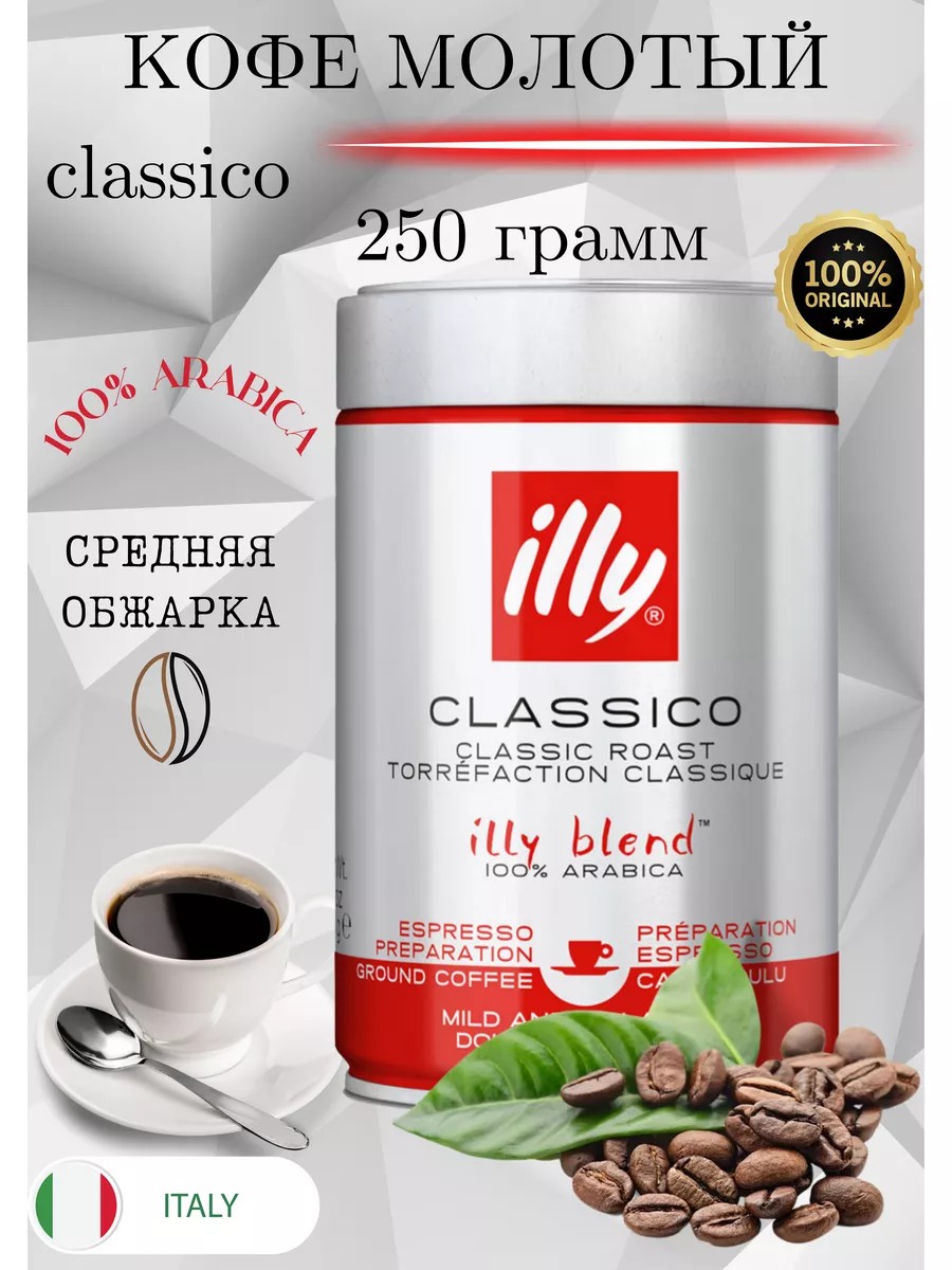 Кофе молотый ILLY CLASSICO идеальный подарок для истинных ценителей. Легендарная элитная смесь из 9 сортов 100% арабики дарит изысканный, неповторимый, ароматный вкус в каждой чашке.