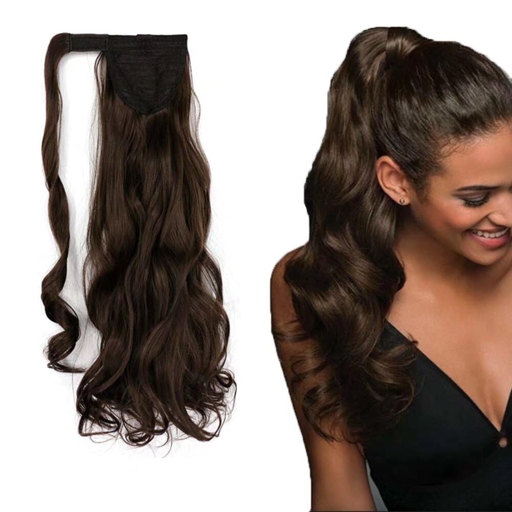 iLUU Long Curly Wavy Ponytail Extension Synthetic Hairpiece Wrap Around Clip in Ponytail Hair Extensions #8 Chocolate Brown Natural Hair Ponytails for Women Girl Lady Magic Paste Ponytail (18" 100g) #8-chocolate brown
