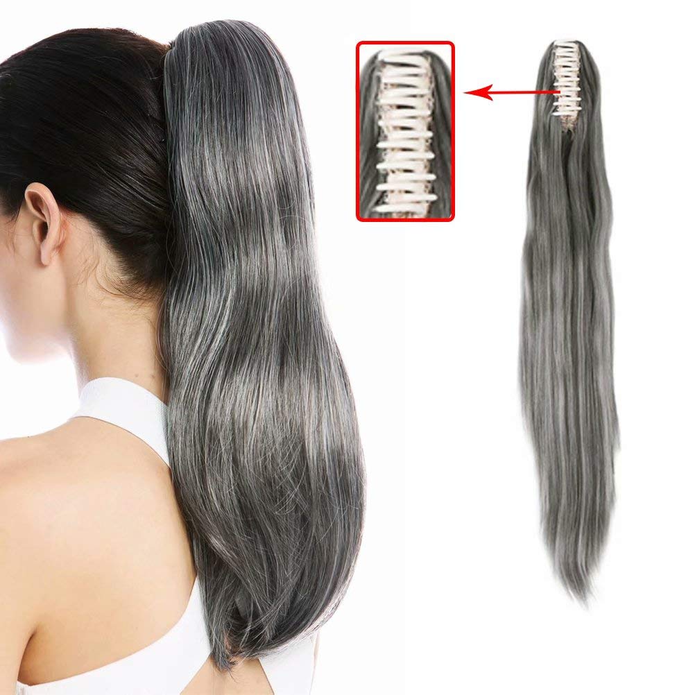 fiber). 4. Do not brush when wet allow Hair to naturally dry hang to air dry or use a blow dryer on a low setting. Tips for Hair Care 1. We recommend deep conditioning once a week or once a fortnight since there Is no natural nutrition to the extensions like or own hair. 2. Please apply some essence oil to the end of the extensions, which can avoid frizzing. 3. Let the hair dry naturally, do not use hair dryer, and comb your hair with wide tooth comb or your fingers. Feature: * Easy to apply and ready to wear in minutes * Naturally blends into your own hair – people will not know you are wearing extensions * Glamorous new look without damaging your own hair * Provides secure yet comfortable attachment for all day wear * Reusable, Washable, Will keep style by using a little shampoo washed in cold water * Attached by a claw/crocodile clip with drawstring which will make you comfortable for all day * If you are not sure whether the hair color is match your hair, pls send your hair picture to us, we will give you some advise Note: Please keep the items as the original condition. Any further question, please contact our customer service.Add Volume and Length: Perfect for adding volume and length to your ponytail. For glamour, fashion and elegance, and at any occasions. Easy Wash: Reusable and Washable, you can wash in cold water by using a little shampoo. Easy Wear: Transforming your look in seconds, can be worn for a prom, party, wedding, live show, cosplay, halloween, costume, or for out, or for daily use, or for fun. Simple Install and Durable: The claw clip is strong that could keep the ponytail in the place, and there is rubber bands mixed with claw, make it more durable, not easy to fall off. Pack Including: One Piece 150g 24" Grey Straight Claw Ponytail Hair Extensions. Not real hair but like real ponytail extension, synthetic hairpiece could be straightened and curled, dyed is not recommended.