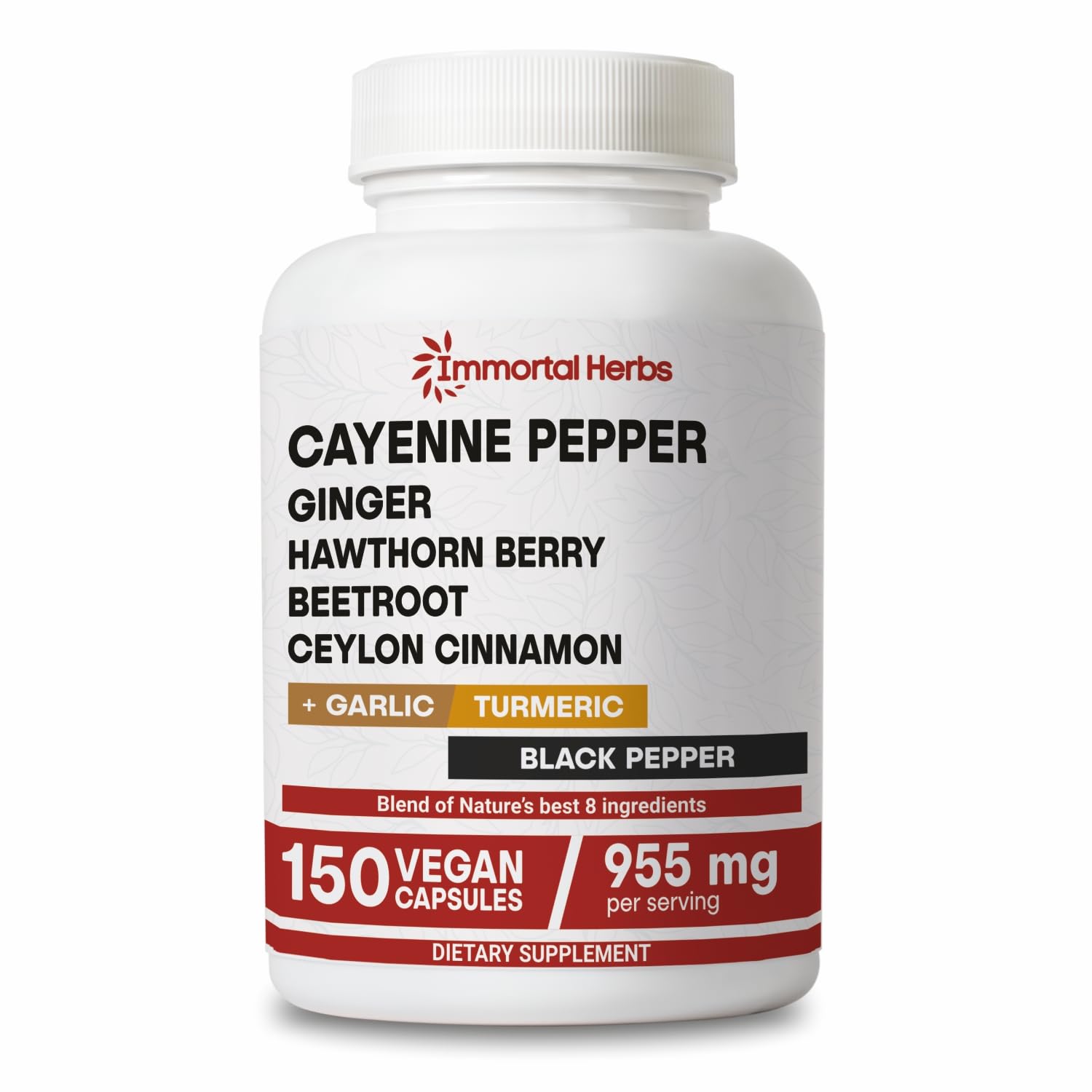 Inspired by Nature, Backed by Science: At Immortal Herbs, we blend ancient herbal traditions with modern scientific practices. By incorporating these cayenne pepper capsules into a balanced lifestyle, you can support your journey toward a healthier, more vibrant life. Discover the benefits of nature's finest ingredients with a supplement designed for vitality and resilience. Premium Quality You Can Trust: Manufactured in a state-of-the-art facility adhering to GMP, ISO and USDA standards, our cayenne pepper supplements undergo meticulous processes to ensure their purity and potency. With high-quality ingredients like cayenne pepper with garlic and turmeric, you can trust every capsule to deliver consistent quality in every dose. Optimized Daily Supply for Convenience: Each bottle of our Cayenne Pepper Capsules contains 150 cayenne capsules, offering a two-and-a-half-month supply. With a recommended serving size of just 2 capsicum capsules daily, this cayenne pepper and ginger supplement seamlessly integrates into your daily wellness routine. These capsules are vegan, non-GMO, and gluten-free, making them suitable for a wide range of dietary needs. Potent Cayenne Pepper Extract: Each serving of our cayenne pepper extract capsules delivers of powerful herbal ingredients, including cayenne pepper extract, beetroot extract, ginger extract, garlic extract, hawthorn berry extract, Ceylon cinnamon extract, turmeric extract, and 95 black pepper extract for enhanced absorption. Experience the synergy of nature's most potent ingredients in every dose. Holistic Herbal Formula: Our Cayenne Pepper Capsules are formulated with a robust blend of cayenne pepper, ginger, hawthorn berry, and turmeric. This comprehensive herbal complex combines nature's most traditional spices in one convenient capsule. Whether you're looking for cayenne pepper pills or a multi-herb capsaicin supplement, this formula offers a diverse blend of botanicals for your daily routine.