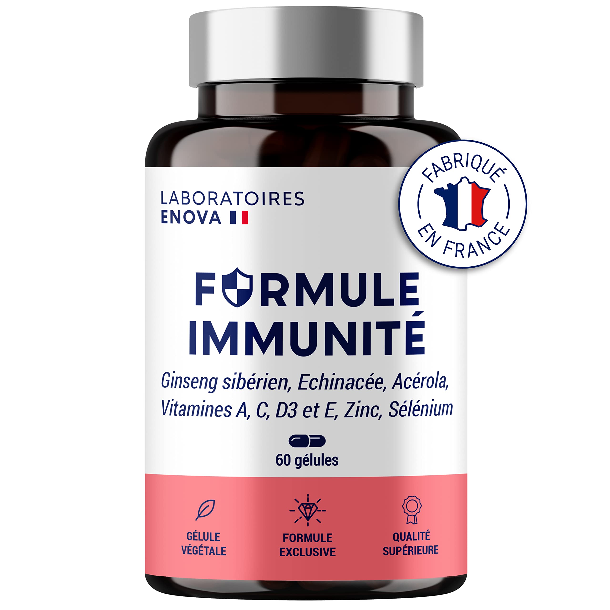 MADE IN FRANCE: Laboratoires Enova is a 100 French company. Each step is carried out in France: R D is located in Lille, the design team in Nice, manufacturing takes place in Brittany, the logistics team is in Paris and Customer Service in Limoges. ✓ HOW TO USE IT? We wanted to develop a product that is easy to take, so that taking this formula is not an additional mental burden but becomes automatic every morning: two capsules per day in the morning with a large glass of water. EXPERTISE QUALITY: We compose our formulas ourselves and choose the best ingredients to meet your needs. We also select our suppliers and raw materials to be sure to offer you quality products at the best price. WITH PLANTS: to accompany these vitamins and minerals, we have chosen to add plants. Siberian Ginseng, the root of the Eleutherococcus plant, strengthens the body's defenses and the immune system. Highly renowned in herbal medicine, Echinacea Purpurea also has an effect on immunity. VITAMINS AND MINERALS: Immunity Formula contains a blend of vitamins and minerals to contribute to the normal functioning of the immune system. According to Health Authorities, vitamin C, vitamin A, and zinc contribute to the normal functioning of the immune system. Vitamin E and selenium have an antioxidant role. Finally, vitamin D3 contributes to the normal absorption and utilization of calcium and phosphorus.MADE IN FRANCE : Les Laboratoires Enova sont une entreprise 100 Française. Chaque étape est réalisée en France : la R D est localisée à Lille, l'équipe design à Nice, la fabrication a lieu en Bretagne, l'équipe logistique est à Paris et le Service Client à Limoges. ✓ COMMENT L'UTILISER ? Nous voulions développer un produit simple à prendre, pour que la prise de cette formule ne soit pas une charge mentale supplémentaire mais que ça devienne un automatisme chaque matin : deux gélules par jour le matin avec un grand verre d'eau. EXPERTISE QUALITÉ : Nous composons nous-même nos formules et nous choisissons les meilleurs ingrédients pour répondre à vos besoins. Nous sélectionnons également nos fournisseurs et les matières premières pour être certain de vous proposer des produits de qualité au meilleur prix. AVEC DES PLANTES : pour accompagner ces vitamines et minéraux, nous avons choisi d'ajouter des plantes. Le Ginseng Sibérien, racine de l'eleuthérocoque, renforce les défenses de l'organisme et le système immunitaire. Très réputée en herboristerie, l'Echinacea Purpurea a également une action sur l'immunité. VITAMINES ET MINÉRAUX : Formule Immunité contient un mélange de vitamines et minéraux pour contribuer au fonctionnement normal du système immunitaire. Selon les Autorités de Santé, la vitamine C, la vitamine A et le zinc contribuent au fonctionnement normal du système immunitaire. La vitamine E et le sélénium ont un rôle antioxydant. Enfin la vitamine D3 contribue à l'absorption et l'utilisation normale du calcium et du phosphore.