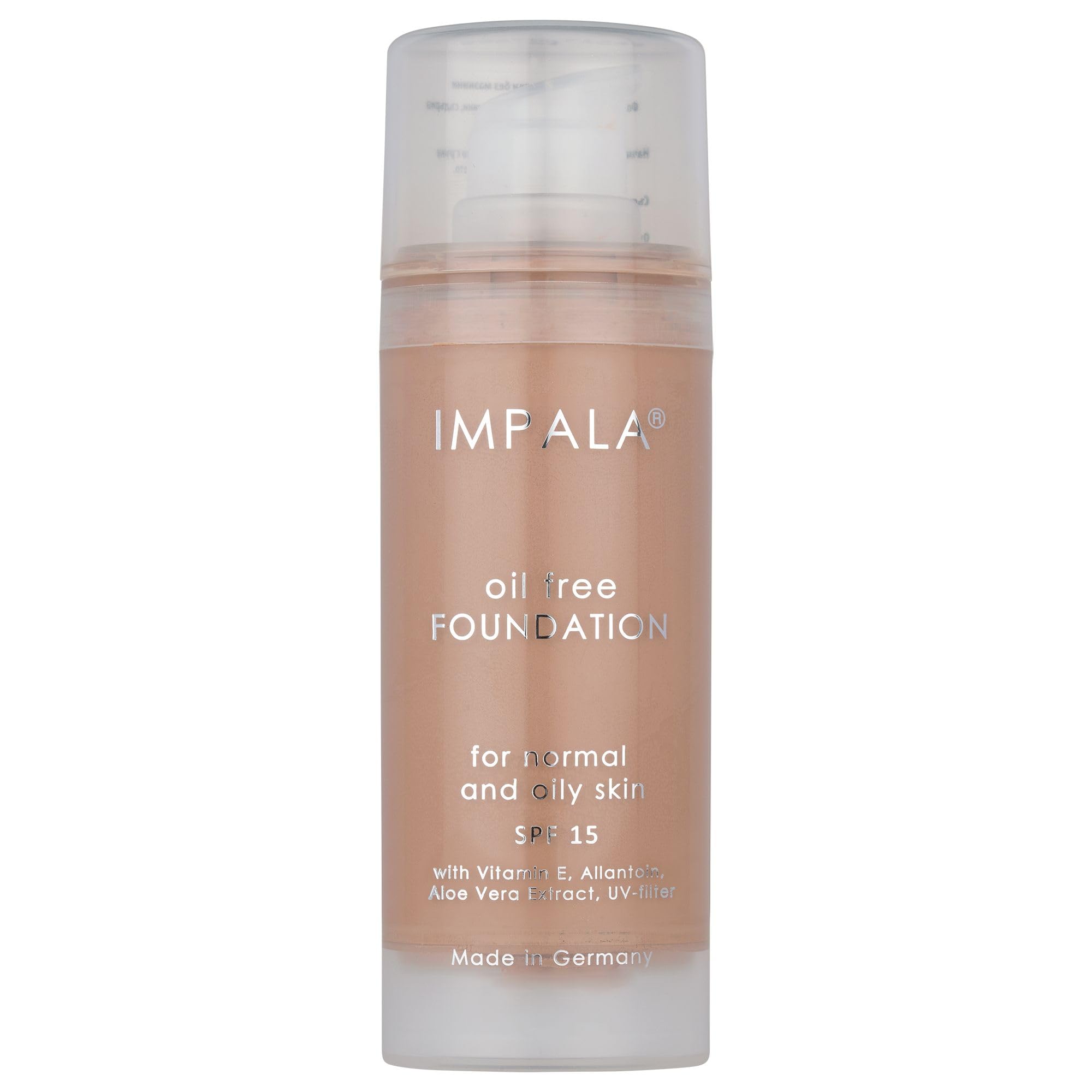 This foundation, with its formula that combines a natural matte finish, medium to high coverage, and SPF 15, is perfect for normal to oily skin. It won't damage the skin or irritate acne-prone areas. It provides great comfort thanks to its lightweight and long-lasting formula, which helps minimize the appearance of pores and other skin imperfections. The packaging allows for 100 use of the product. INGREDIENTS Aqua, Cyclopentasiloxane, Glycerin, Titanium Dioxide, C11-12 Isoparaffin, Aluminum Starch Octenylsuccinate, Cetyl Peg Ppg-10 1, Dimethicone, Polyglyceryl-4 Isostearate, Sorbitan Isostearate, Ethylhexyl Methoxycinnamate, Butyl Methoxydibenzoylmethane, Diethylhexyl Adipate, Lauroyl Lysine, Magnesium Sulfate, Nylon-12, Simmondsia Chinensis Seed Oil, Phenoxyethanol, Synthetic Beeswax, Alumina, Butylene Glycol, Disteardimonium Hectorite, Ethylhexylglycerin, Tocopheryl Acetate, Behenyl Beeswax, Stearyl Beeswax, Talc, Benzoic Acid, Simethicone, Dehydroacetic Acid, Carbomer, Alcohol Denat., Aloe Barbadensis Leaf Juice Powder, Dimethicone, Lactic Acid, Serine, Sodium Lactate, Sorbitol, Tea-Lactate, Urea, Polysorbate 20, Sodium Chloride, Sodium Benzoate, Palmitoyl Oligopeptide, Palmitoyl Tetrapeptide-7, Bht, Allantoin, CI - 77891, 77491, 77492, 77499.6 shades. Thanks to its economical pump dispenser, you can use 100 of the product. Made in Germany. This formula combines a natural matte finish with medium to full coverage and SPF 15. Perfect for normal to oily skin, it won't damage the skin or irritate acne-prone skin. It contains vitamin E, allantoin, aloe vera extract, and a UV filter. It provides great comfort as it is lightweight and long-lasting, helping to minimize the appearance of pores and other skin imperfections.Impala Foundation Sans Huile N04 Visage Peau Grasse Longue Tenue SPF 15 avec PompeDESCRIPTION DU PRODUIT DESCRIPTION DU PRODUIT Ce fond de teint avec une formule qui combine une finition mate naturelle, la couverture moyenne et haute de la peau avec SPF 15 est parfait pour les peaux normales ou grasses, sans endommager la peau ou porter atteinte aux personnes souffrant d'acné. Assure un grand confort car elle fait partie légère et durable pour aider à réduire les pores et autres imperfections de la peau. Il peut être utilisé à 100 du produit en raison de l'emballage de celui-ci. INGRÉDIENTS Aqua, Cyclopentasiloxane, Glycerin, Titanium Dioxide, C11-12 Isoparaffin, Aluminum Starch Octenylsuccinate, Cetyl Peg Ppg-10 1, Dimethicone, Polyglyceryl-4 Isostearate, Sorbitan Isostearate, Ethylhexyl Methoxycinnamate, Butyl Methoxydibenzoylmethane, Diethylhexyl Adipate, Lauroyl Lysine, Magnesium Sulfate, Nylon-12, Simmondsia Chinensis Seed Oil, Phenoxyethanol, Synthetic Beeswax, Alumina, Butylene Glycol, Disteardimonium Hectorite, Ethylhexylglycerin, Tocopheryl Acetate, Behenyl Beeswax, Stearyl Beeswax, Talc, Benzoic Acid, Simethicone, Dehydroacetic Acid, Carbomer, Alcohol Denat., Aloe Barbadensis Leaf Juice Powder, Dimethicone, Lactic Acid, Serine, Sodium Lactate, Sorbitol, Tea-Lactate, Urea, Polysorbate 20, Sodium Chloride, Sodium Benzoate, Palmitoyl Oligopeptide, Palmitoyl Tetrapeptide-7, Bht, Allantoin, CI - 77891, 77491, 77492, 77499.6 tons. Merci à son emballage très économique avec pompe, vous pouvez utiliser 100 du montant du produit. Fabriqué en Allemagne. Formule qui combine un fini mat naturel, moyenne et forte couverture de la peau avec SPF 15. Parfait pour une peau normale ou grasse, sans endommager la peau ou porter atteinte aux personnes souffrant d'acné. La vitamine E, allantoïne, extrait d'Aloe Vera et filtre UV. Assure un grand confort car elle fait partie légère et durable pour aider à réduire les pores et autres imperfections de la peau.