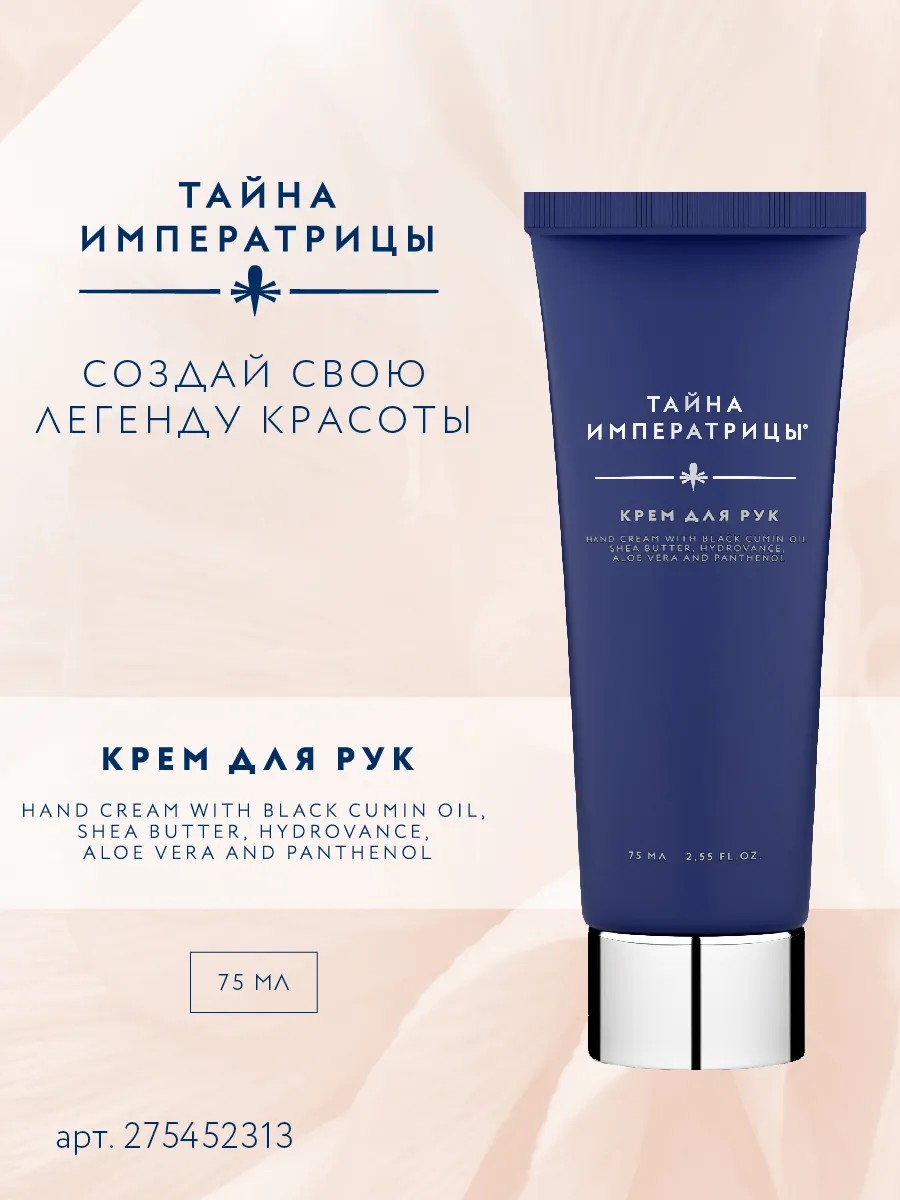 Кожа на руках зачастую подвергается влиянию негативных факторов, температуры, бытовой химии. Успокоить нежную кожу рук, восстановить и обогатить ее питательными компонентами поможет крем «Тайна Императрицы». В формулу крема вошла комбинация высокоэффективных компонентов: алоэ вера, пантенол и гидрованс увлажняют, а масло ши и черный тмин успокаивают раздраженную кожу, придают ей эластичность и гладкость.