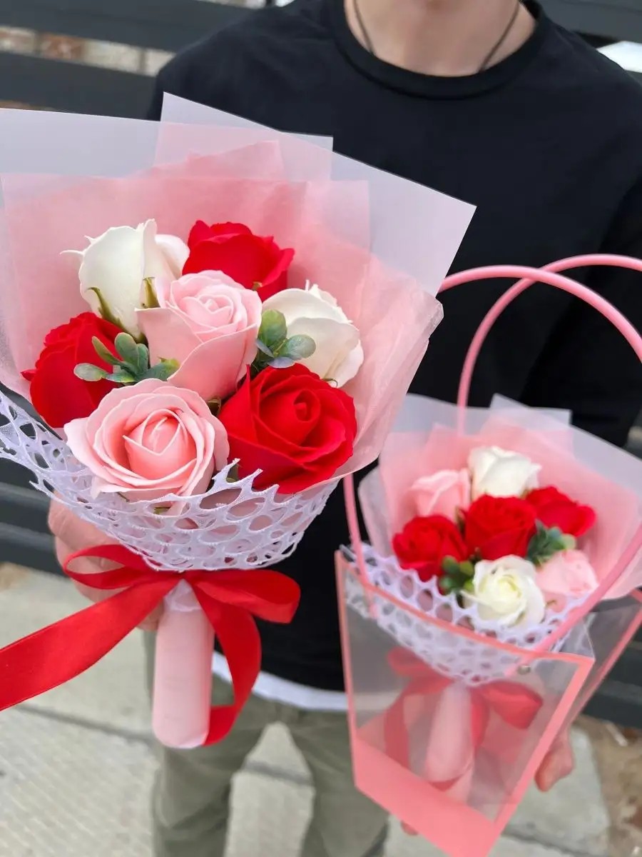 | Комплектация | сумочка с ручами, 7 роз из мыла, зелень, упаковка дизайнерская, открытка |