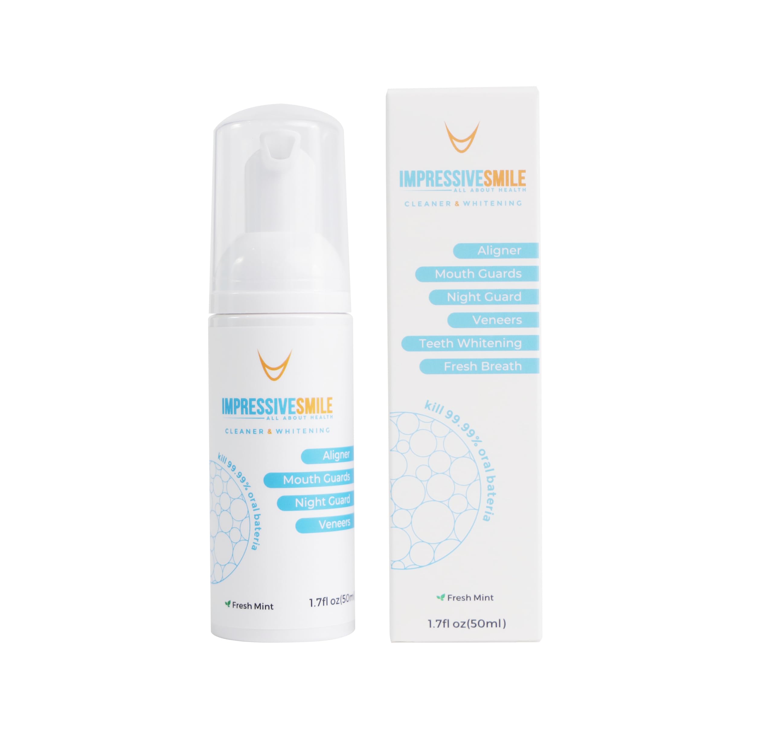 Compatibility: Suitable for all dental appliances like aligners, retainers, mouthguards, nightguards, veneers, dentures, and more. It is compatible with all aligners and retainers including Invisalign, Essix, Byte, CandidCo, Vivera, ClearCorrect, and Hawley retainers. It's your all-in-one cleaning solution for all dental appliances. Perfect for All Dental Devices: Cleaning dental aligner can be a pain, especially when you are on a go. Retainers are meant to last for years, but are equally prone to build-up, odors and stains. With regular use Impressive Smile dental appliance cleaner will prevent cloudiness and yellowing in your aligners and retainers. Our formula will remove buildup in your trays and plaque on your teeth, as well as prevent yellowing so your aligners and attachments remain unnoticeable. Clean Mouth: Impressive Smile formula is great for easy cleaning of all dental appliances, teeth whitening, fresh breath. Mint-tasting formula kills destructive elements in your aligners and mouth that cause bad breath, and tooth decay. Upon testing Impressive Smile foaming bubbles against our top competitor, we discovered that our foaming bubbles are more stable and last longer, thus provide better cleaning and whitening results. Benefit of the long-lasting bubbles is that they can inflate into hard-to-reach spaces giving you a meticulous clean. Teeth Whitening: You can whiten teeth 3-4 shades in just 4 weeks. Impressive Smile formula contains enriched anionic hydrogen peroxide, which contributes to gentle teeth whitening with essentially no tooth sensitivity. Our teeth whitening method works better than whitening strips, gels, and pens during aligner treatment. Main difference is that our formula reaches the enamel under aligner attachments and buttons, providing an even whitening of your teeth, making Impressive Smile dental appliance cleaner a better tooth whitening solution during aligner treatment. Easy Cleaning: Impressive Smile dental appliance cleaner incredibly easy to use, safe and instantly wearable. Our clean formula gives you complete dental appliance and oral health care in one expedient mess-free application. Dispense a full pump of foam inside your appliance, and place it directly back into your mouth. Wear it with confidence! No brushing, rinsing, or soaking required.