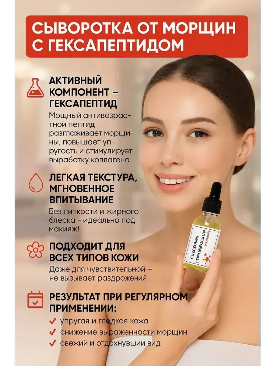 | Комплектация | Сыворотка для лица против морщин с гексапептидами - 1 шт. |