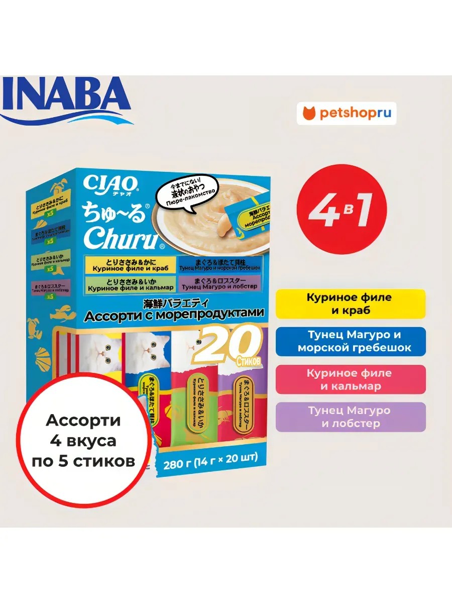 Inaba Лакомство-пюре для кошек Ассорти с морепродуктами,14г*20шт.