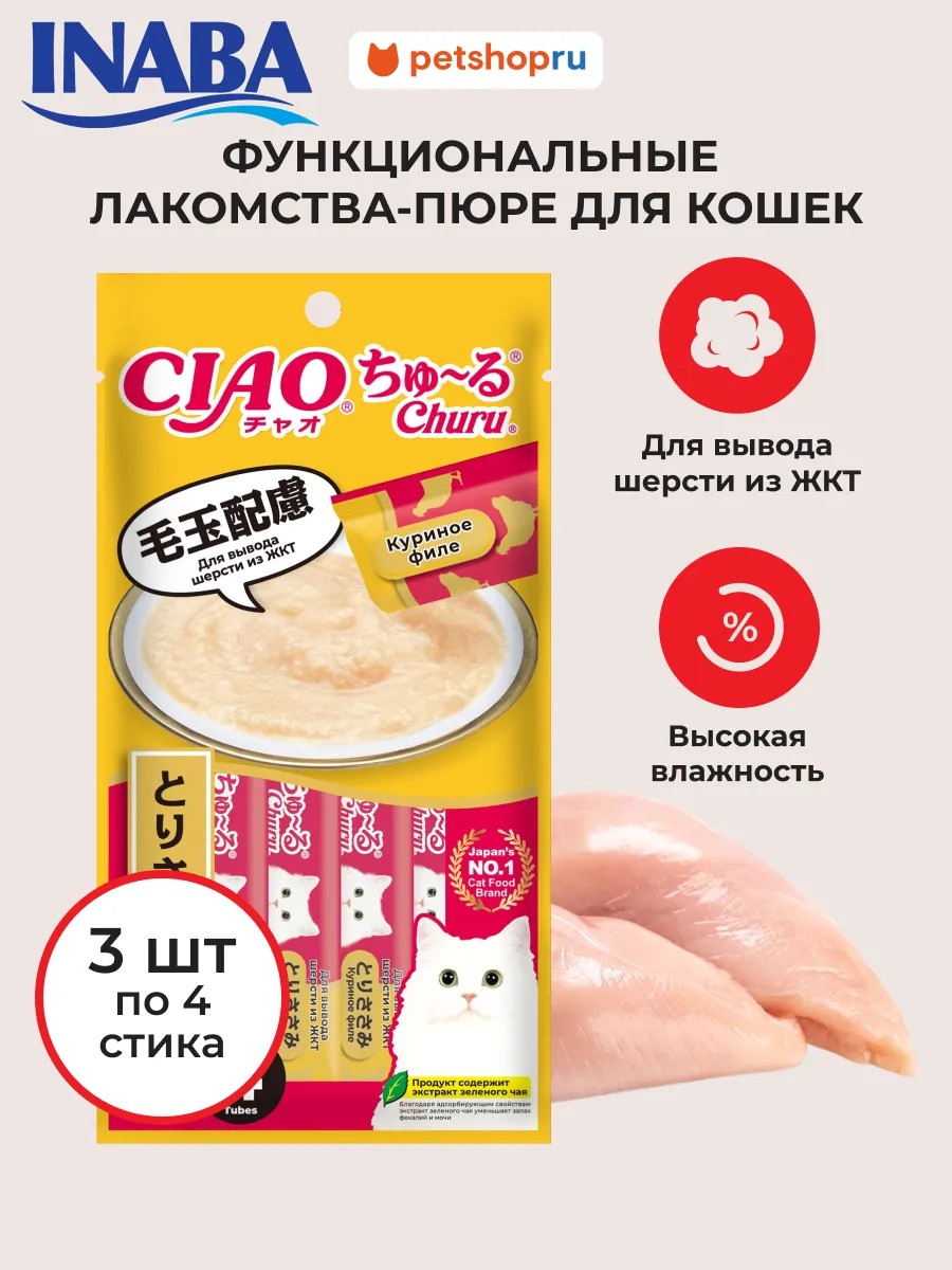 CIAO Churu functional puree and treat made with tender farm-raised chicken fillet. Contains fiber, which helps remove hair from the gastrointestinal tract. This puree from the Japanese manufacturer Inaba is made exclusively from natural ingredients and has a high moisture content, which helps maintain the cat's water balance.