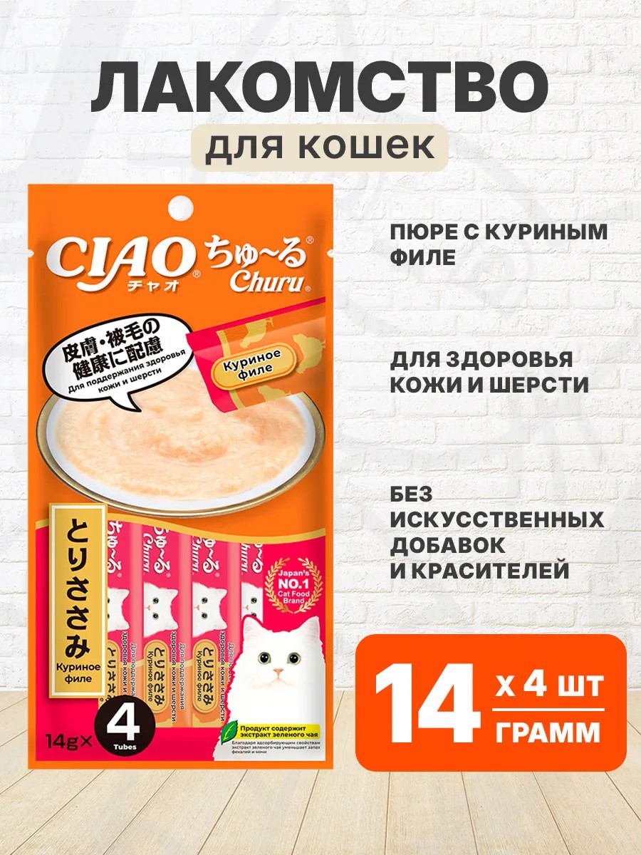 Супер-премиальное функциональное лакомство пюре Ciao Churu (Чао Чуру) для кошек на основе кусочков нежного филе фермерской курицы от японского производителя Inaba изготовлено исключительно из натуральных полезных ингредиентов и отличается высоким процентом влажности, благодаря чему поддерживается водный баланс организма кошки.