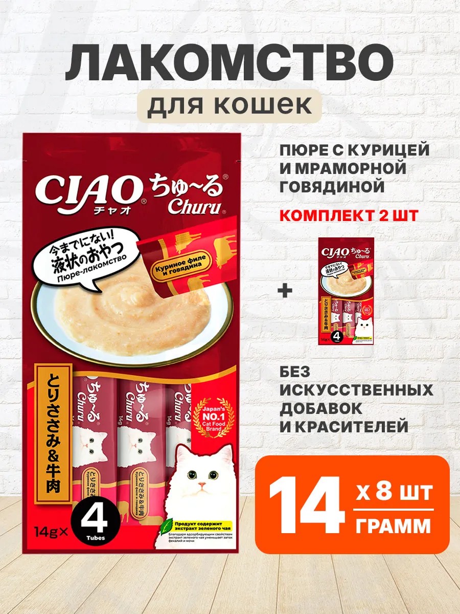Супер-премиальное лакомство пюре Ciao Churu (Чао Чуру) для кошек на основе кусочков нежного филе фермерской курицы с говядиной от японского производителя Inaba изготовлено исключительно из натуральных полезных ингредиентов и отличается высоким процентом влажности, благодаря чему поддерживается водный баланс организма кошки.