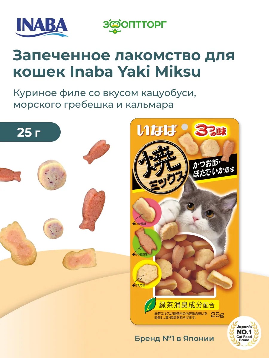 Запеченное мягкое лакомство Yaki Miksu (ЯКИМИКСУ) на основе куриного филе и тунца Кацуо от японского производителя Inaba. В каждой пачке микс с тремя разными вкусами и каждый вкус имеет свою уникальную форму (рыбка, кальмар и тд.), такое лакомство понравится даже самой привередливой кошке. Корма и лакомства Inaba отличаются высоким качеством и неповторимым вкусом, ведь они изготавливаются только из отборных традиционных японских ингредиентов! Во все продукты добавлен экстракт зеленого чая, который, благодаря содержанию катехина, нейтрализует неприятные запахи содержимого кишечника. Лакомство обогащёно витамином Е - натуральным антиоксидантом, поддерживающим иммунную систему, не содержит искусственных добавок, красителей и консервантов.