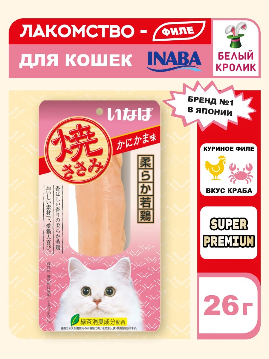 Порадуйте своего пушистого друга изысканным лакомством INABA Yakisasami! Это нежное куриное филе с вкусом краба от японского бренда Inaba, которое точно понравится даже самым привередливым кошкам.