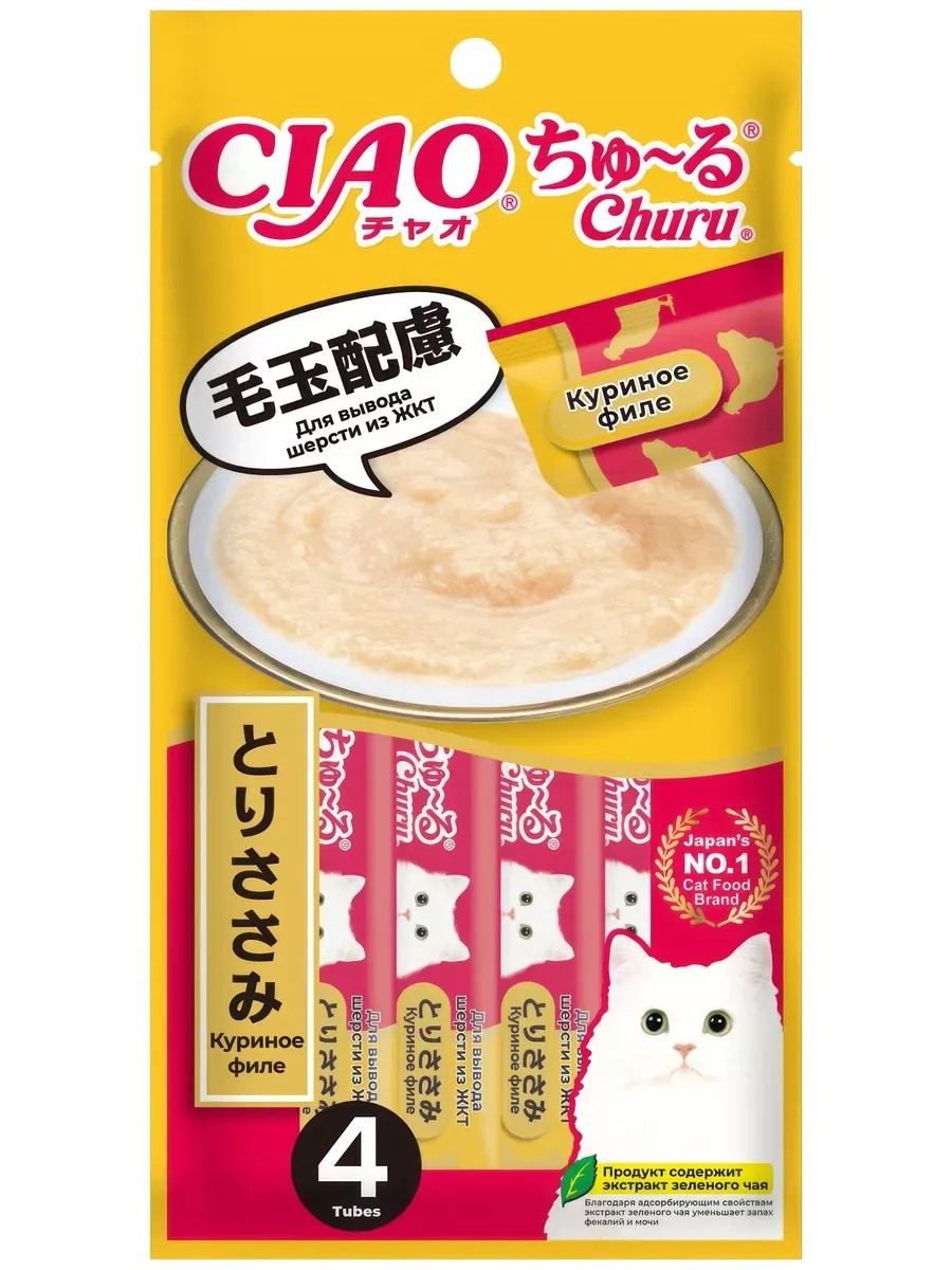 Inaba Ciao Churu Cat Treat (Puree), Chicken Fillet, 56g. Inaba Ciao Churu Cat Treat (Puree), Hair Removal, Chicken Fillet (4 pcs. 14g each), 56g. CIAO Churu is a functional puree treat made from tender farm-raised chicken fillet. Contains fiber, which helps remove hair from the gastrointestinal tract. This puree from the Japanese manufacturer Inaba is made exclusively from natural ingredients and has a high moisture content, which helps maintain the cat's hydration balance. Inaba foods and treats are distinguished by their high quality and unique taste, as they are made only from selected traditional Japanese ingredients! Convenient packaging allows you to hand-feed your pet, using the treat as a reward or training aid, or use it as a topping for dry or wet food. All products contain green tea extract, which, thanks to the catechin content, neutralizes unpleasant odors of intestinal contents. The puree-delicacy is enriched with vitamin E - a natural antioxidant that supports the immune system, does not contain artificial additives, colors and preservatives. Ingredients: chicken fillet, chicken extract, yeast extract, starch, calcium phosphate, fiber, thickener, fructooligosaccharides, taurine, vitamin E, green tea extract, red fermented rice. Analytical composition: protein 8.3%, fat 1%, fiber 0.3%, ash 1.3%, moisture 88.5%. Energy value: 40 kcal (10 kcal * 4 pcs).
