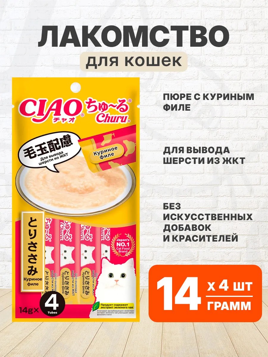 Супер-премиальное функциональное лакомство пюре Ciao Churu (Чао Чуру) для кошек на основе кусочков нежного филе курицы от японского производителя Inaba изготовлено исключительно из натуральных полезных ингредиентов и отличается высоким процентом влажности, благодаря чему поддерживается водный баланс организма кошки.