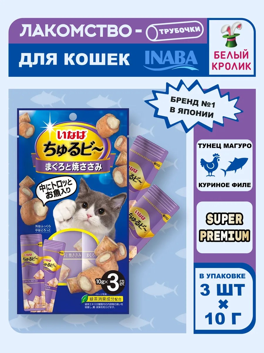 Порадуйте своего пушистого друга с супер-премиальным лакомством Churu Bee от японского производителя Inaba! Эти запеченные трубочки с нежной кремовой начинкой созданы специально для самых привередливых кошек и котов. Основные ингредиенты — отборное филе фермерской курицы и кусочки мяса тунца Магуро, что делает лакомство не только вкусным, но и полезным.