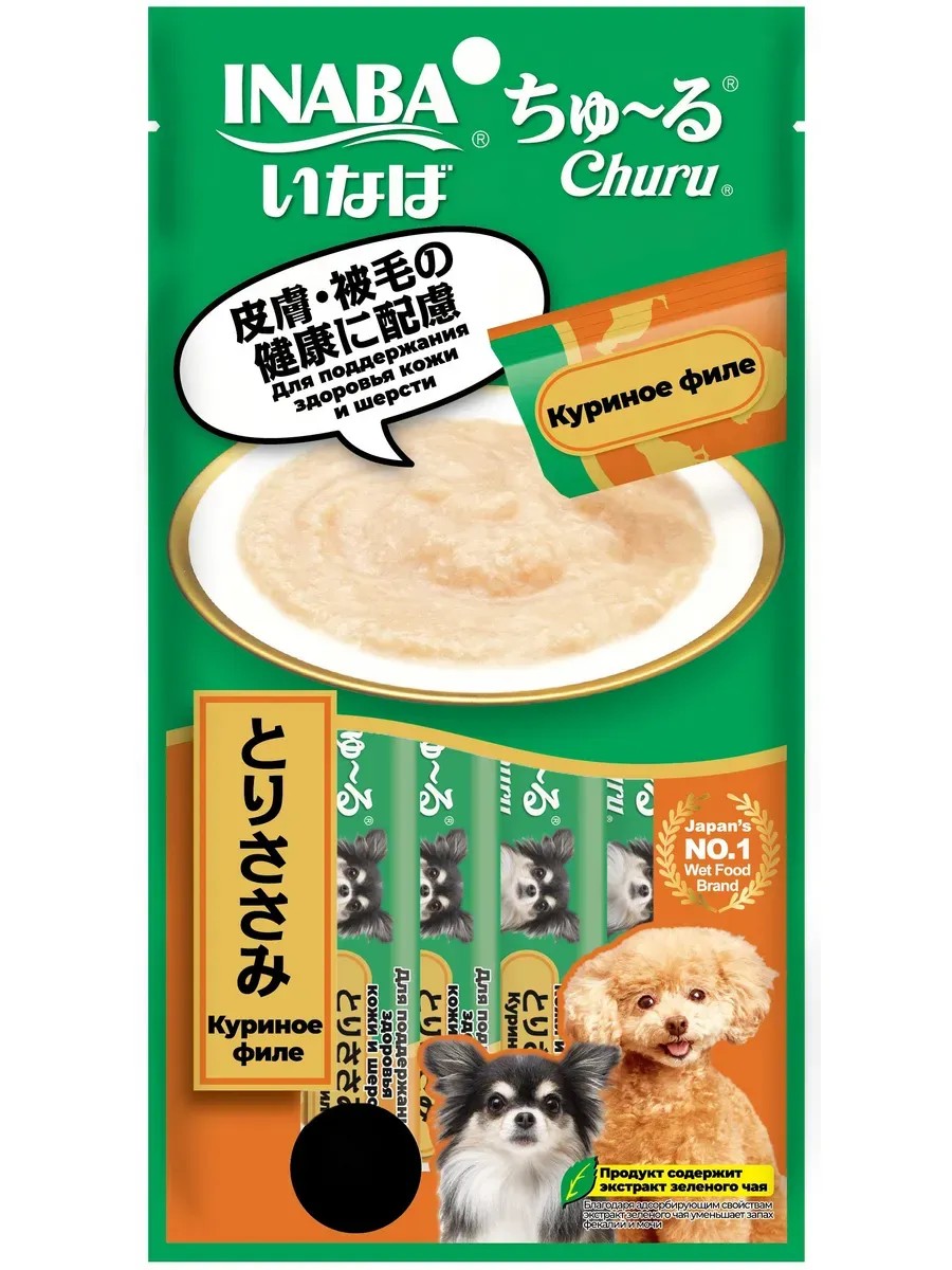 Inaba Churu Dog Treats (Puree), Healthy Skin and Coat, Chicken Fillet, (4 pcs. 14 g), 56 g. Inaba Churu Dog Treats (Puree), Healthy Skin and Coat, Chicken Fillet, (4 pcs. 14 g), 56 g. Functional Churu puree treats with chicken fillet for maintaining healthy skin and coat from the Japanese manufacturer Inaba are made exclusively from natural ingredients and have a high moisture content, which helps maintain the dog's water balance. Inaba food and treats are distinguished by high quality and unique taste, because they are made only from selected traditional Japanese ingredients! Convenient packaging allows you to feed your pet directly from your hand, using the treat as a reward or training, or use it as a topping for dry or wet food. All products contain green tea extract, which, thanks to the catechin content, neutralizes unpleasant intestinal odors. The composition is enriched with vitamin E - a natural antioxidant that supports the immune system, does not contain artificial additives, colors and preservatives. Ingredients: chicken fillet, chicken fat, starch, chicken extract, vegetable oil, thickener, yeast extract, calcium phosphate, chitosan, vitamin E, collagen, fish oil, red fermented rice, green tea extract. Analytical composition: protein 6.8%, fat 1.4%, fiber 0.9%, ash 0.7%, moisture 87.6% Energy value: 25 kcal (6.25 * 4)