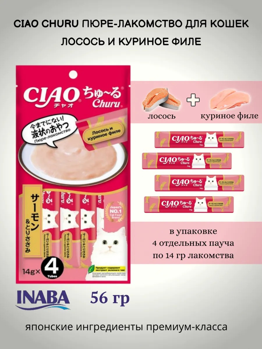 INABA CIAO Churu – нежное пюре для кошек с лососем и куриным филе