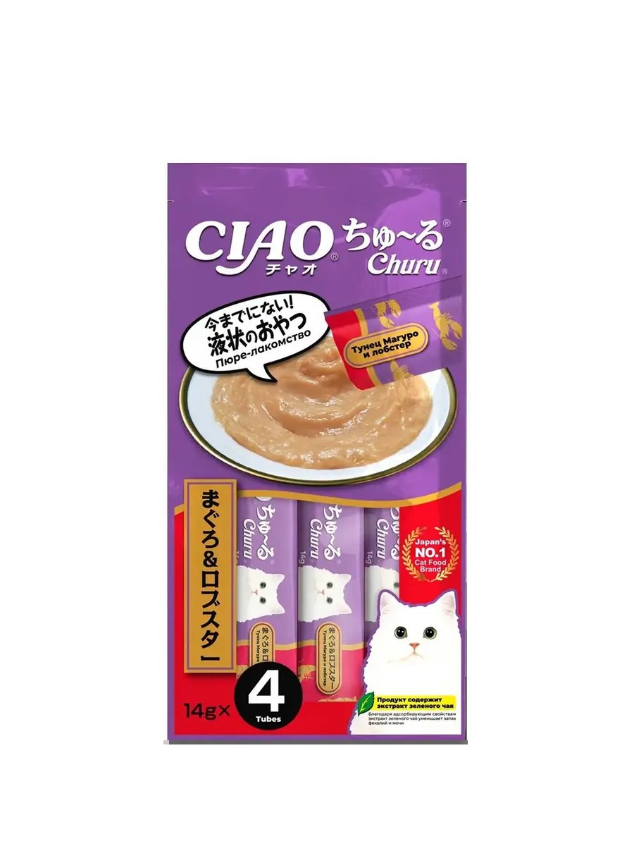 Супер-премиальное лакомство пюре CIAO Churu (ЧАО ЧУРУ) для кошек на основе кусочков мяса глубоководного тунца Магуро с добавлением лобстера от японского производителя Inaba изготовлено исключительно из натуральных полезных ингредиентов и отличается высоким процентом влажности, благодаря чему поддерживается водный баланс организма кошки. Кремовая текстура, напоминающая пюре или суп, подойдет даже самым привередливым кошкам и котам или кошкам с чувствительным пищеварением.