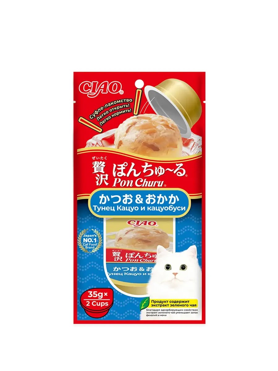 Состав; тунец Кацуо, куцуобуси, крахмал, экстракт кацуобуси, загуститель, дрожжевой экстракт, агар-агар, таурин, олигосахариды, витамин Е, красный ферментированный рис, экстракт зеленого чая.