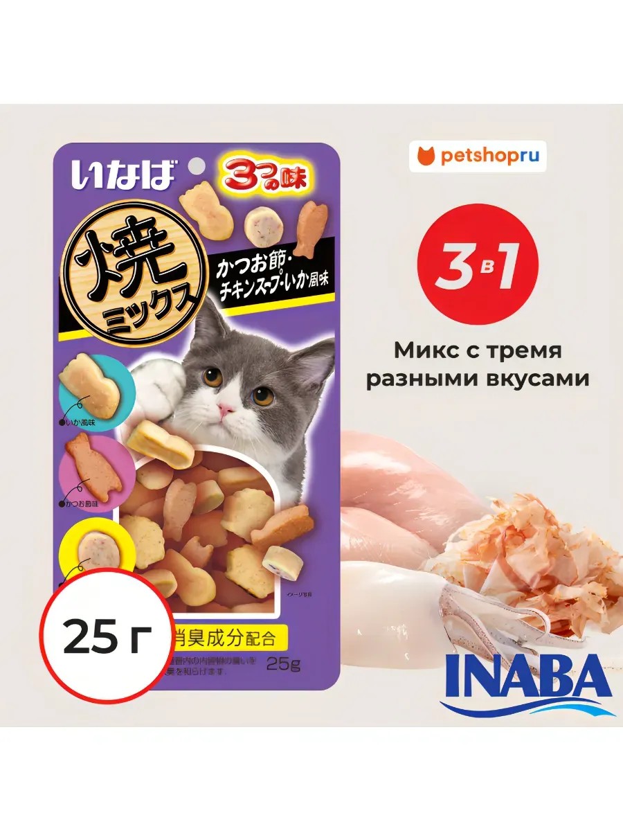 Запеченное мягкое лакомство Yaki Miksu (ЯКИМИКСУ) на основе куриного филе и тунца Кацуо от японского производителя Inaba. В каждой пачке микс с тремя разными вкусами и каждый вкус имеет свою уникальную форму (рыбка, кальмар и тд.), такое лакомство понравится даже самой привередливой кошке.