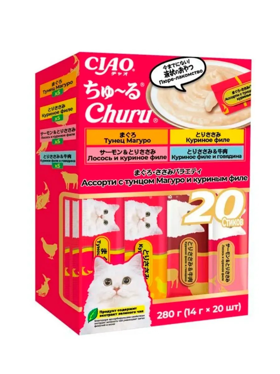 The CIAO Churu assortment of super-premium pureed treats, featuring Maguro tuna and tender farm-raised chicken fillet, from Japanese manufacturer Inaba, is made exclusively from natural ingredients and boasts a high moisture content, helping maintain your cat's hydration balance.