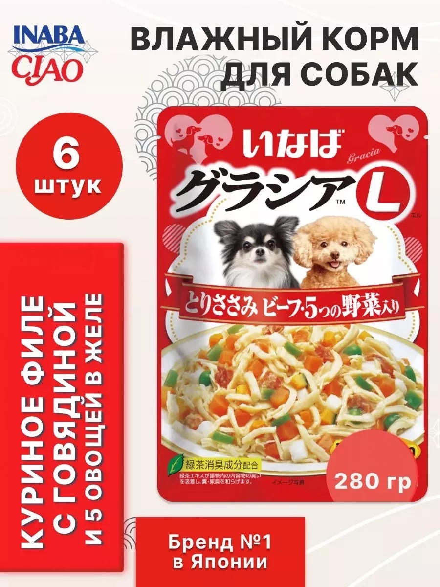 Влажный корм для собак INABA Gracia L в желе, куриное филе с говядиной и 5 видами овощей (6шт х 280гр).