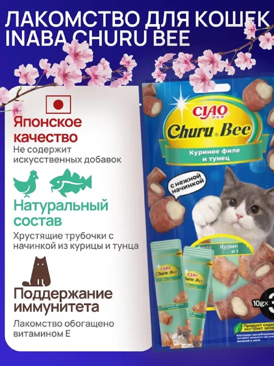 Запеченные трубочки Ciao Churu Bee (ЧАО ЧУРУ БИ) с нежной кремовой начинкой на основе куриного филе и тунца от японского производителя Inaba, трубочки имеют усиленный вкус вяленого тунца Кацуо, поэтому лакомство не оставит равнодушным даже самых привередливых кошек. Корма и лакомства Inaba отличаются высоким качеством и неповторимым вкусом, ведь они изготавливаются только из отборных традиционных японских ингредиентов! Во все продукты добавлен экстракт зеленого чая, который, благодаря содержанию катехина, нейтрализует неприятные запахи содержимого кишечника. Лакомство обогащено витамином Е - натуральным антиоксидантом, поддерживающим иммунную систему, не содержит искусственных добавок, красителей и консервантов.