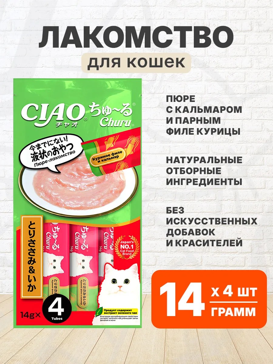 Супер-премиальное лакомство пюре Ciao Churu (Чао Чуру) для кошек на основе кусочков мяса глубоководного тунца Магуро с добавлением кальмара от японского производителя Inaba изготовлено исключительно из натуральных полезных ингредиентов и отличается высоким процентом влажности, благодаря чему поддерживается водный баланс организма кошки.