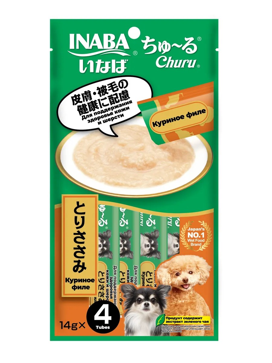 Функциональное пюре-лакомство Churu (ЧУРУ) на основе куриного филе для поддержания здоровья кожи и шерсти от японского производителя Inaba изготовлено исключительно из натуральных ингредиентов и отличается высоким процентом влажности, благодаря чему поддерживается водный баланс организма собаки. Корма и лакомства Inaba отличаются высоким качеством и неповторимым вкусом, ведь они изготавливаются только из отборных традиционных японских ингредиентов! Удобная упаковка позволяет кормить питомца прямо с рук, используя лакомство для поощрения или дрессировки или использовать его как топпинг к сухому или влажному корму. Во все продукты добавлен экстракт зеленого чая, который, благодаря содержанию катехина, нейтрализует неприятные запахи содержимого кишечника. Состав обогащён витамином Е - натуральным антиоксидантом, поддерживающим иммунную систему, не содержит искусственных добавок, красителей и консервантов.