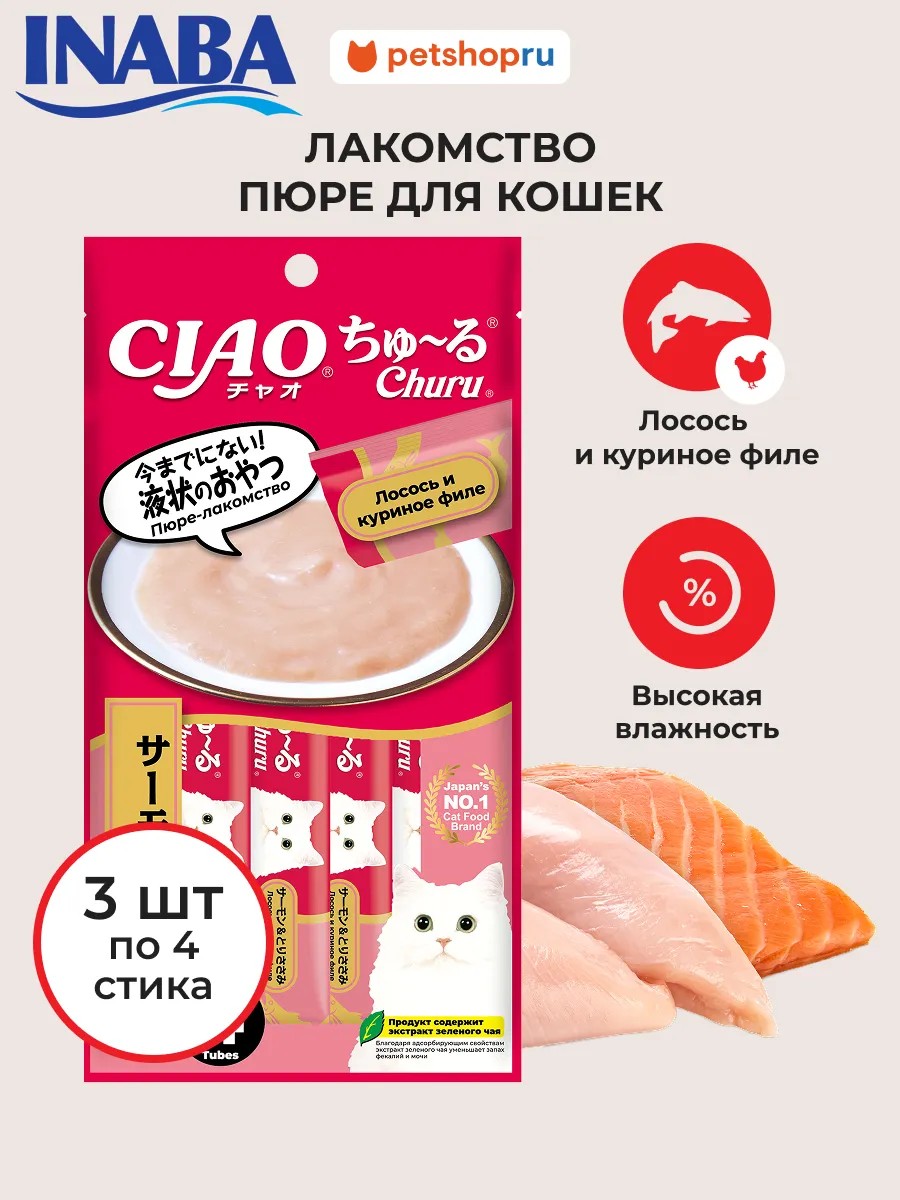Суперпремиальное пюре-лакомство CIAO Churu на основе лосося и нежного филе фермерской курицы от японского производителя Inaba изготовлено исключительно из натуральных ингредиентов и отличается высоким процентом влажности, благодаря чему поддерживается водный баланс организма кошки. Корма и лакомства Inaba отличаются высоким качеством и неповторимым вкусом, ведь они изготавливаются только из отборных традиционных японских ингредиентов!