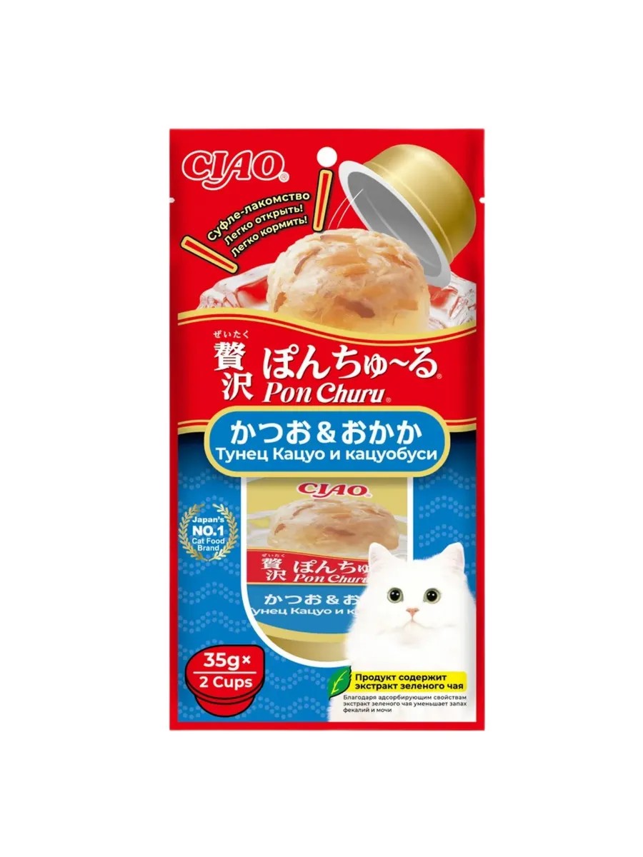 INABA, Katsuo Tuna and Katsuobushi Soufflé for Cats, 35g. This enticing, delicate soufflé treat, CIAO Pon Churu, made with Katsuo tuna and katsuobushi, comes in convenient, single-serving packaging and is designed to pamper your cat.