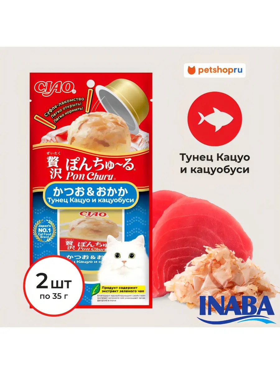 Привлекательное нежное суфле лакомство CIAO Pon Churu (ЧАО ПОН ЧУРУ) на основе тунца Кацуо и кацуобуси, в удобной порционной упаковке, создано, чтобы побаловать кошку. В упаковке две порции в удобной упаковке, которую достаточно просто перевернуть, чтобы угостить питомца.