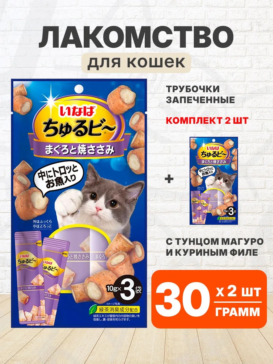 Запеченные трубочки Churu Bee (Чуру Би) с нежной кремовой начинкой на основе куриного филе с тунцом Магуро от японского производителя Inaba.