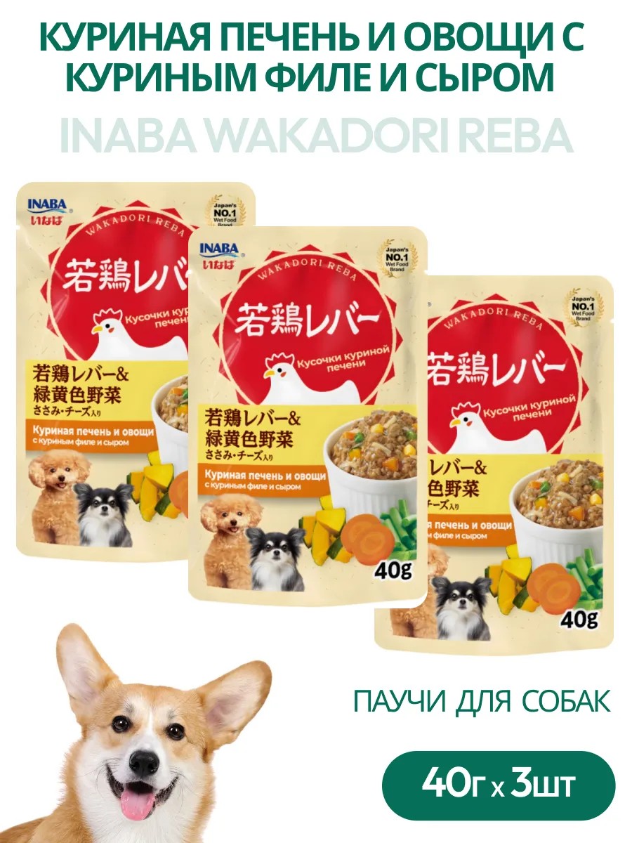 | Полное наименование товара | Inaba Wakadori reba Паучи для собак куриная печень/овощи с куриным филе и сыром 3шт по 40г |