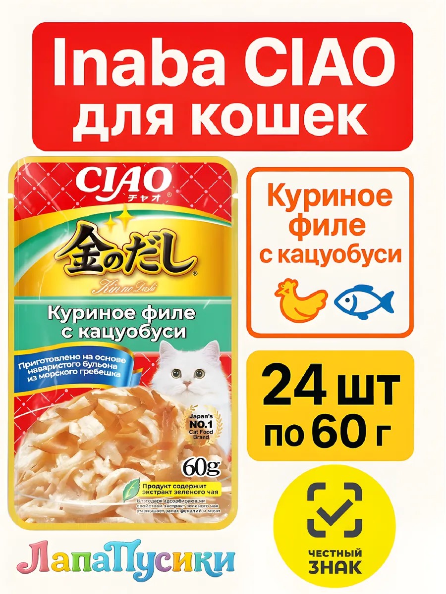 | Полное наименование товара | Влажный корм INABA Kinnodashi для кошек Куриное филе с кацуобуси, пауч, 60 г |