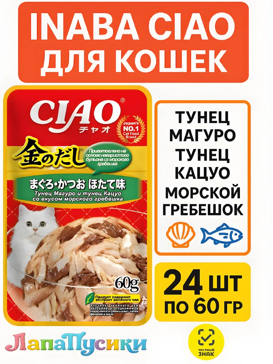 | Полное наименование товара | Влажный корм CIAO Kinnodashi для кошек Тунец Магуро и тунец Кацуо со вкусом морского гребешка, пауч, 60 г |