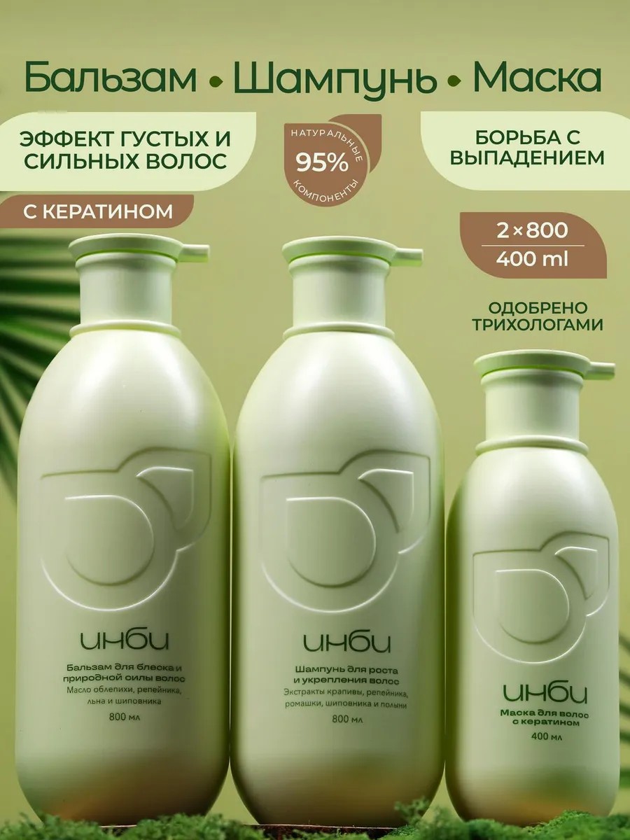 The INBI triple hair set, which includes shampoo, conditioner, and keratin mask, provides complete hair and scalp care. This complex of products is suitable for all hair types, including normal, dry, and damaged hair, as well as oily and combination hair. It can be used even if you have colored, bleached, highlighted, or bleached hair. The shampoo gently cleanses oily scalp and hair from root to tip. Natural plant extracts and oils nourish the roots, promoting hair growth and reducing hair loss. Chamomile extract reduces itching and inflammation, preventing dandruff. The second step is to apply a conditioner. The conditioner is suitable for straight, curly, or wavy hair. It moisturizes without weighing down the hair, sealing every hair cuticle. After just a few uses, you'll notice your hair is much smoother, gaining a healthy shine and strength. It's frizz-free and static-free. This conditioner locks in moisture, seals hair, and significantly reduces split ends. This keratin nourishing hair mask helps restore weakened and damaged locks, thickening them and creating a frizz-free effect. It helps prolong the effects of salon hair treatments, strengthening the results. It reduces breakage and prevents hair loss. Hair becomes straight, smooth, and manageable without weighing it down. Professional hair cosmetics are the best gift for any woman. Furthermore, INBI is a Russian-made product with a laboratory-developed formula approved by trichologists. This is the power of nature for the beauty and health of your hair!